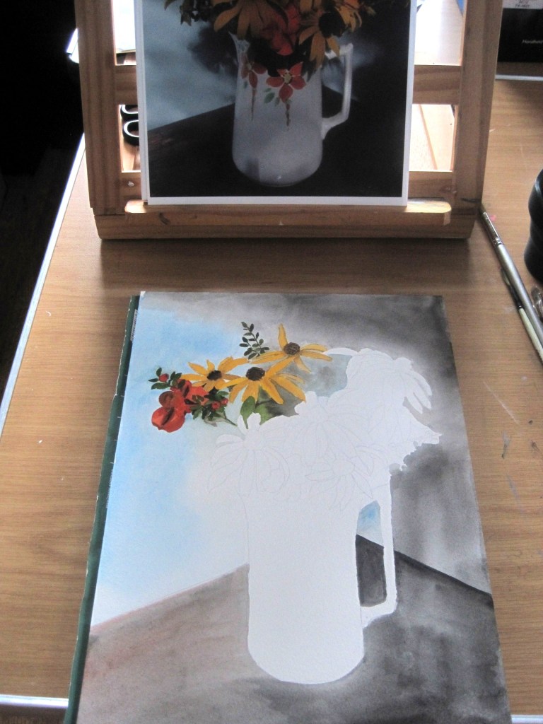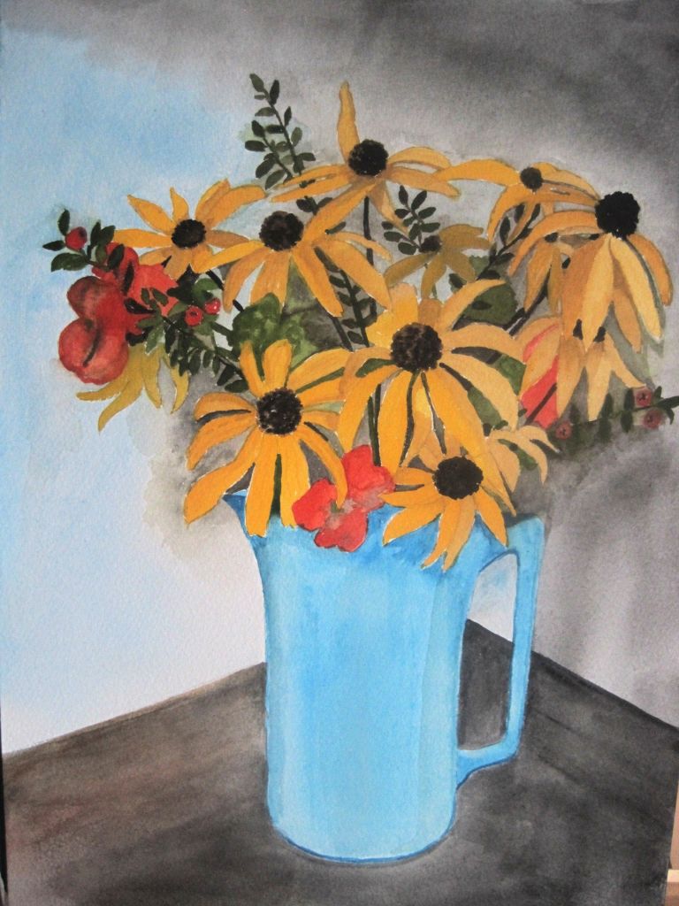 You might remember I started a new painting. I have finished it and I’m fairly happy with it. One or two little niggles but generally ok. I worked from my photo of late Summer flowers I’d picked, drawing it first with pencil then painting it with gouache. I prefer gouache to traditional watercolours because they’re bolder and I enjoy a defined image rather than a washy one.