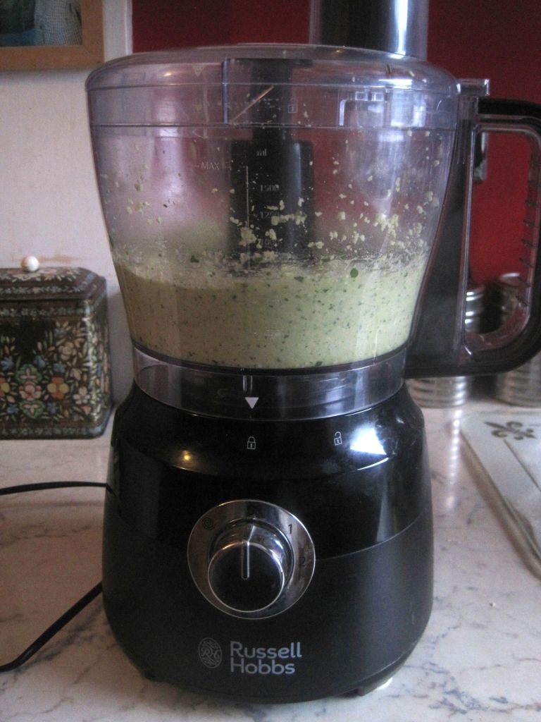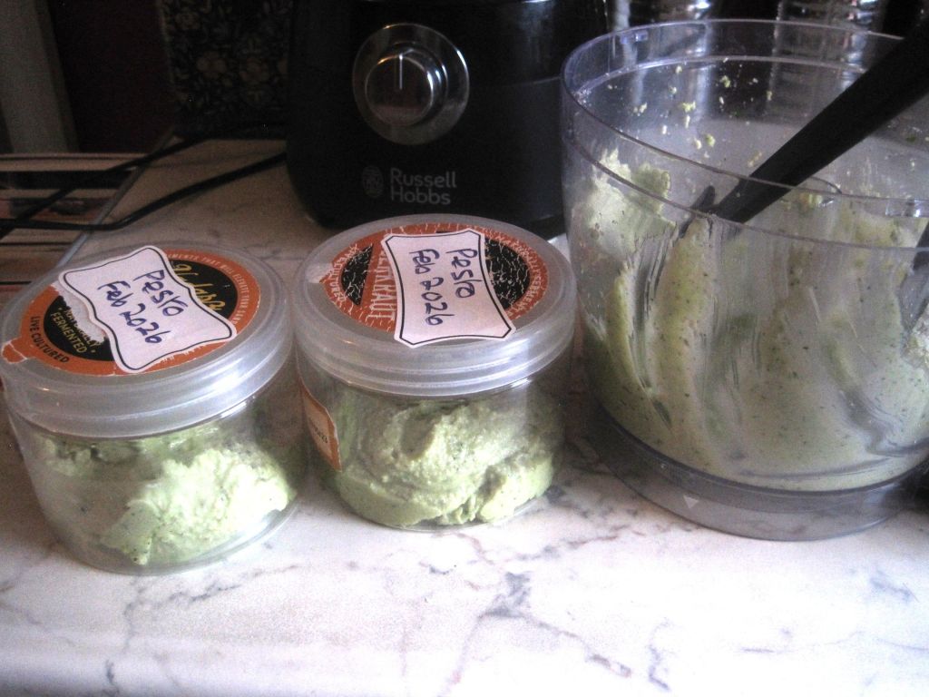 In Summer I grow basil in the greenhouse. It’s delicious in my Italian-style salad. In Winter when it’s too cold to grow it I buy supermarket leaves and make pesto. I usually use Lancashire cheese for my recipe and cashew nuts as I don’t like the taste of pine nuts. I had Cheshire cheese in the fridge so I used that instead to make a new batch. My recipe is in my Earthy Homemaker’s Cookbook. Very easy to make and freezes perfectly in small containers. So handy to use with pasta, a baked potato or crackers. Tastes so much better homemade. When I first bought ready-made pesto I thought it was horrible but freshly made it’s absolutely delicious. Of course, I customised the recipe to suit our tastes.