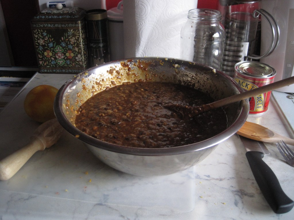 200g self-raising Flour 2 teaspoons of spice (mixed spice, or I use a mixture of ground ginger, cinnamon and cloves) pinch of Salt 150g Breadcrumbs 100g chopped Pecans 2 cooking or sharp Apples, chopped small or grated 300g Raisins 300g Sultanas 80g mixture of chopped Stem Ginger, grated orange and lemon rind and candied peel 4 large Eggs juice of 2 Lemons 2 tablespoons Black Treacle 350g of Dark Sugar 150g Butter 4 tablespoons Rum or Brandy or a mix of the two.