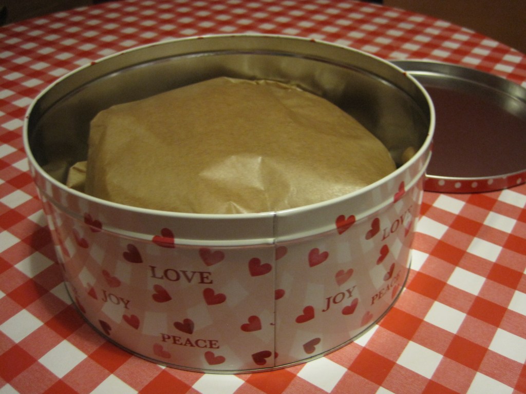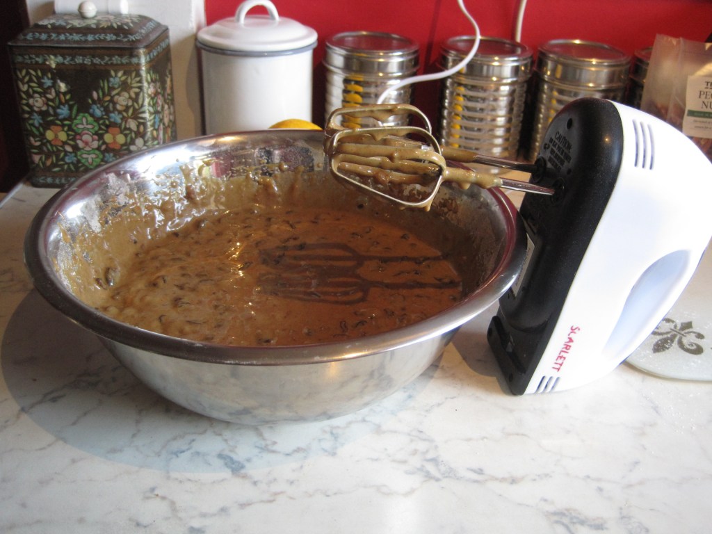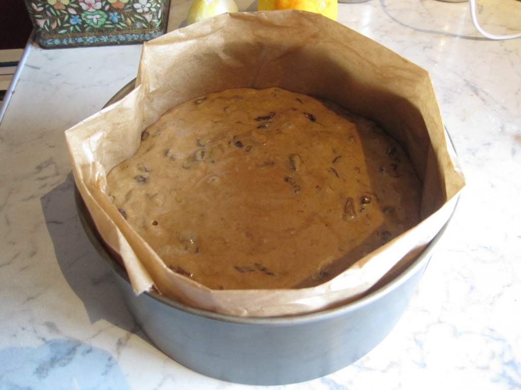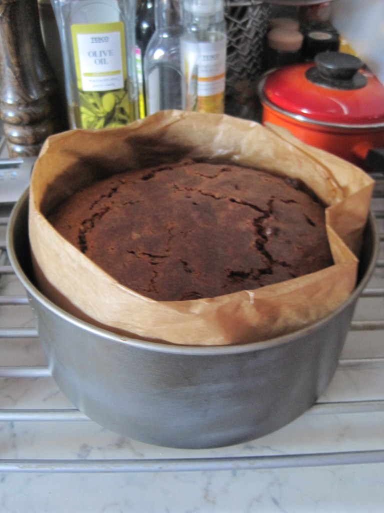 Put the mixture into the tin and bake for 1 and three quarters of an hour. Let it cool for a while then peel back the greaseproof paper. Allow several hours to cool thoroughly then rewrap in clean greaseproof paper and store in an airtight tin. After a couple of weeks, pull back the paper and prick the top of the cake with a fork. Gently spoon in some sherry, 1 – 2 tablespoons. I do this again before Christmas but take care not to make it too soggy.