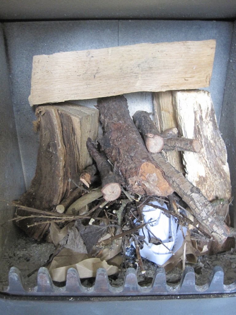 It’s wonderful to see the flickering flames and to hear the gentle hiss of the logs as they burn. It took me a while to get the hang of lighting the stove at first. Over the years I’ve developed techniques for easy starting and no need for those horrible smelly firelighters. I found that standing the logs vertically at either side with paper, dried woody stems and small sticks from our trees with another log placed horizontally across the top worked best. Like this: