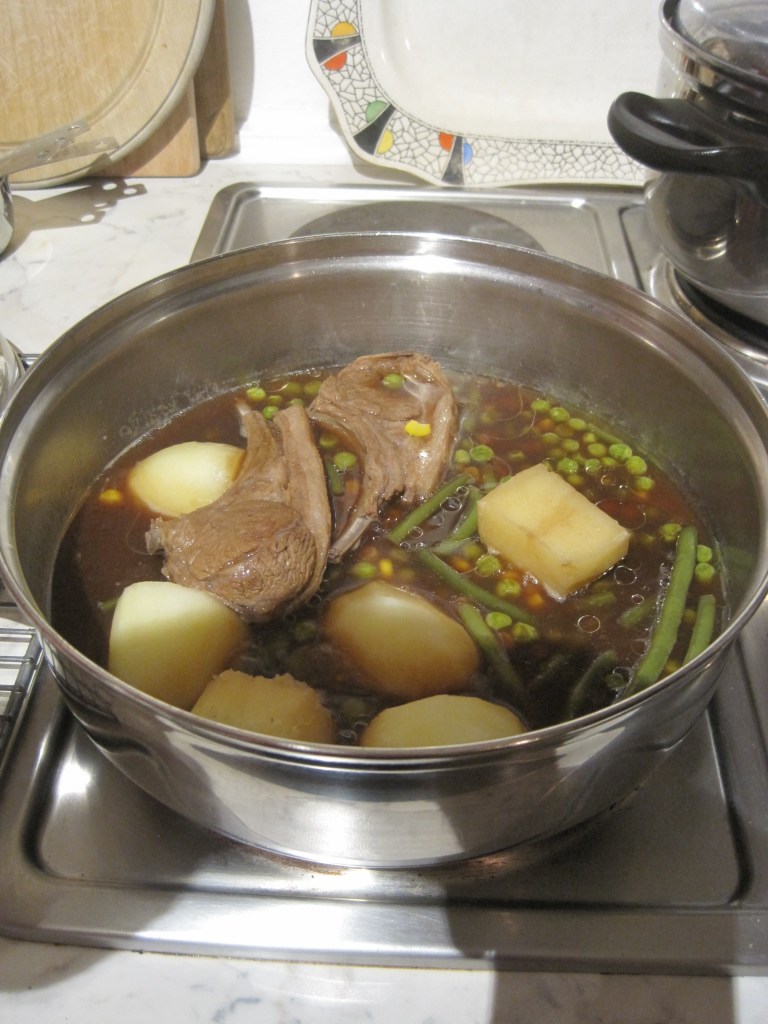 I made another one-pan meal at the weekend with lamb cutlets and vegs. I added some of my parsnip wine to tenderise the cutlets and add a little extra something to the rich stock. Cooking them all together in a small amount of water and adding an oxo cube makes a strong and delicious gravy.