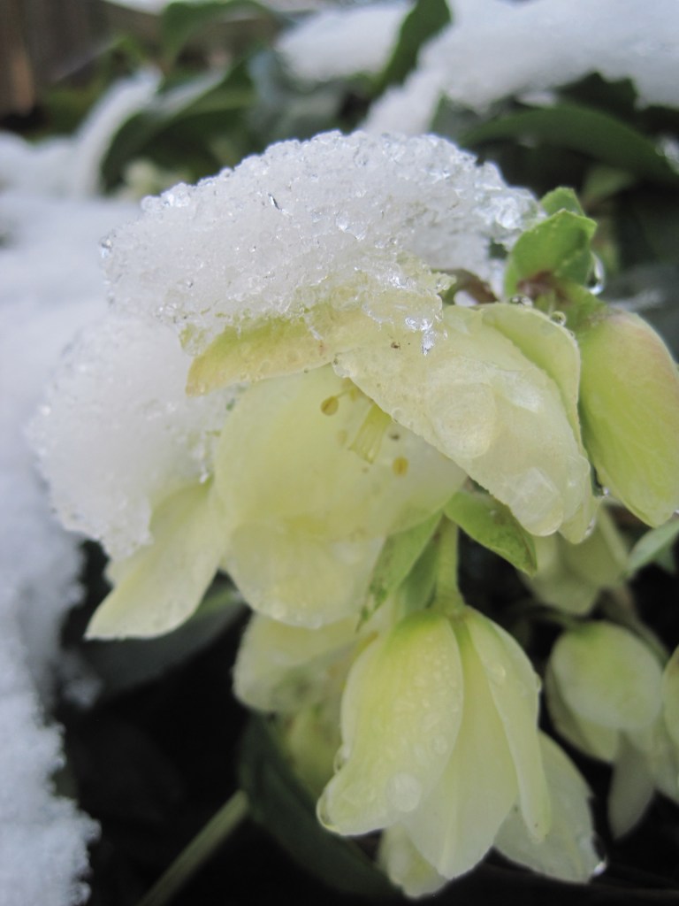 Since Saturday the snow has been melting and I ventured outside to catch a few glimpses of the shining drops and to see how the plants were doing. A few nice flowers brightened the garden, despite the weather.