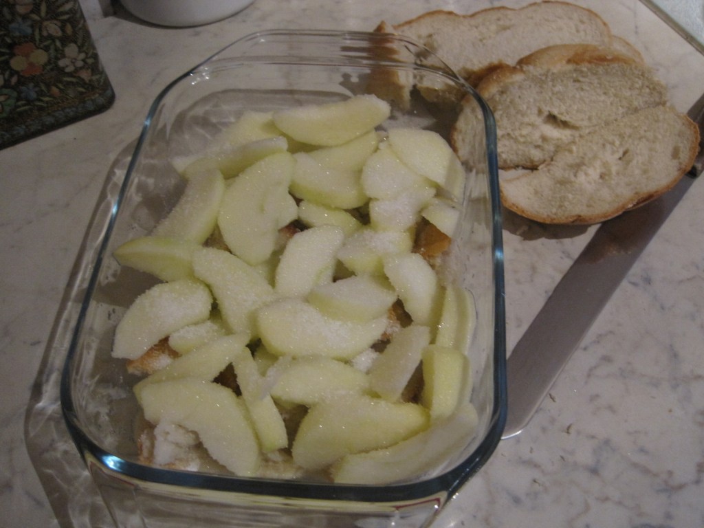 Apple Pobs Pudding 2 cooking Apples 300 ml of milk 4 tablespoons Sugar 1 large Egg Half a White Bloomer Loaf Butter Peel and slice apples into salt water until needed. Warm milk a little. Beat in egg and 2 tablespoons of sugar. Put half the bread, broken into pieces, into a baking dish. Gently pour half the milk onto the bread to soak it. Arrange rinsed apple slices on top. Sprinkle the other 2 tablespoons of sugar over apples. Put the rest of the broken bread on top and carefully pour the remaining milk and egg mixture over. Press down gently to ensure the bread takes up the milk. Dot with butter. Bake at 190c/170 C fan oven for 25 - 30 minutes.
