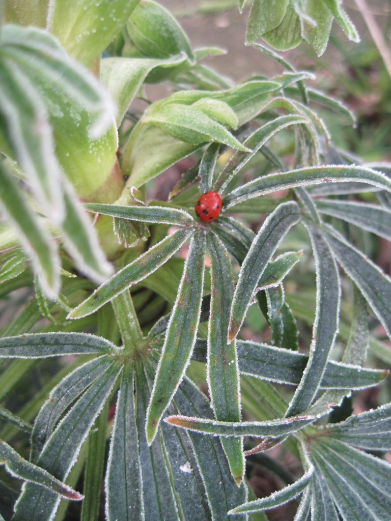 I love the way the frost outlines the edges of the leaves and fragile petals. Surprising that a few flowers are hanging on despite the cold and I even saw a ladybird. I hope it managed to survive the low temperature.