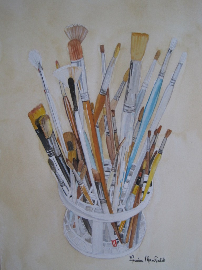 I find them aesthetically pleasing too. They’re good to look at. I’ve just done a painting of my acrylics brushes in their stand. It was difficult to draw and to paint and I’m not completely happy with the picture I produced. I got easily confused by the arrangement of them as they jumbled together. I persevered though and this is the result.
