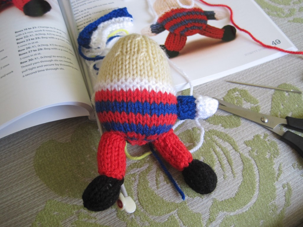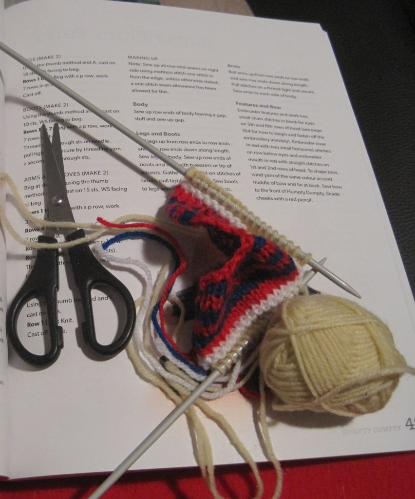 Next I made Humpty Dumpty. He was lovely to knit. An interesting and easy pattern with bright colours. I did a better job on his face and he looks very cheerful.