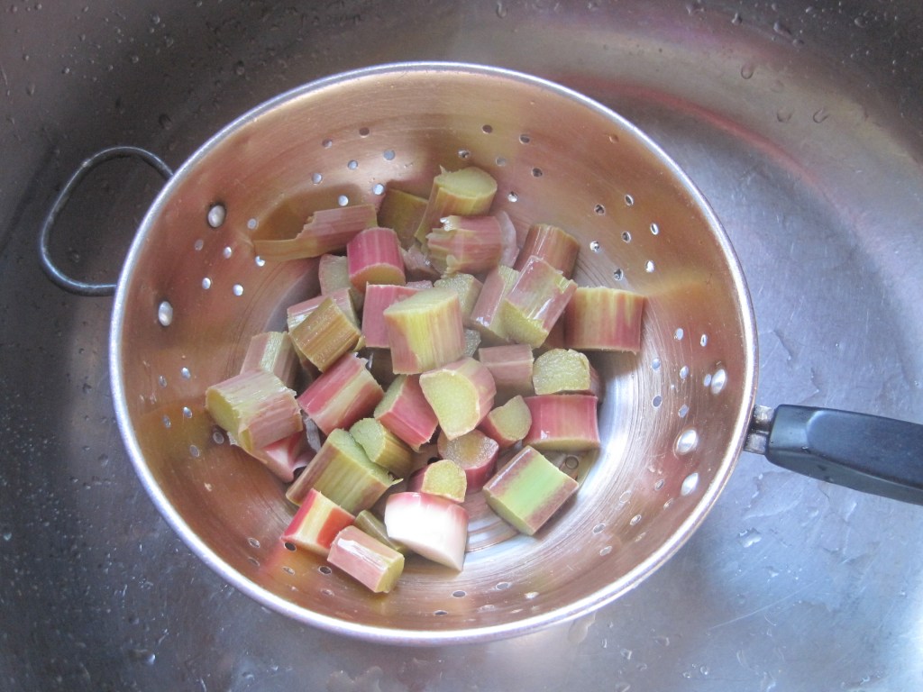 If you don’t like that feeling on your teeth with rhubarb try my little tip. I bring it to the boil then tip the chunks into a colander and rinse with cold water. Tip them back into the pan and stew for a few minutes before adding sugar.