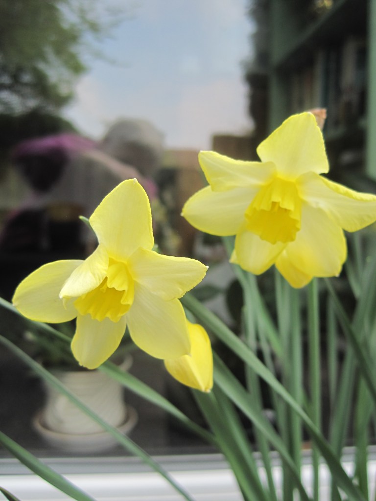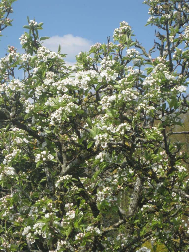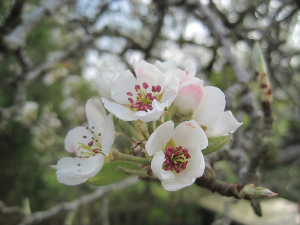 The pear blossom looks lovely from an upstairs window, sillouetted against the blue sky. Close-up, the flowers are so beautiful on the tips of the branches. Creamy-white petals with a hint of pink.