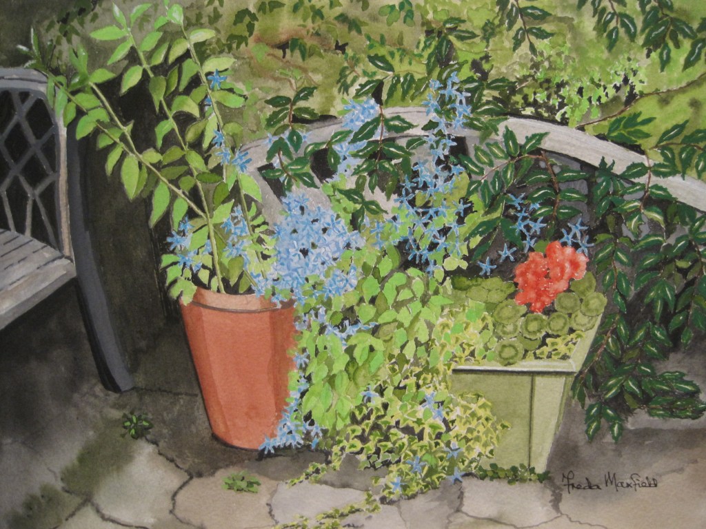 With all the rain I’ve had time to finish my painting. It’s a scene from last summer in the garden. There was a campanula spreading prettily among the leaves poking through the fence. I took a photo and I’ve tried to capture it in my painting. Took a while. Lots of detail to do but enjoyable. Painted with gouache. Here it is.