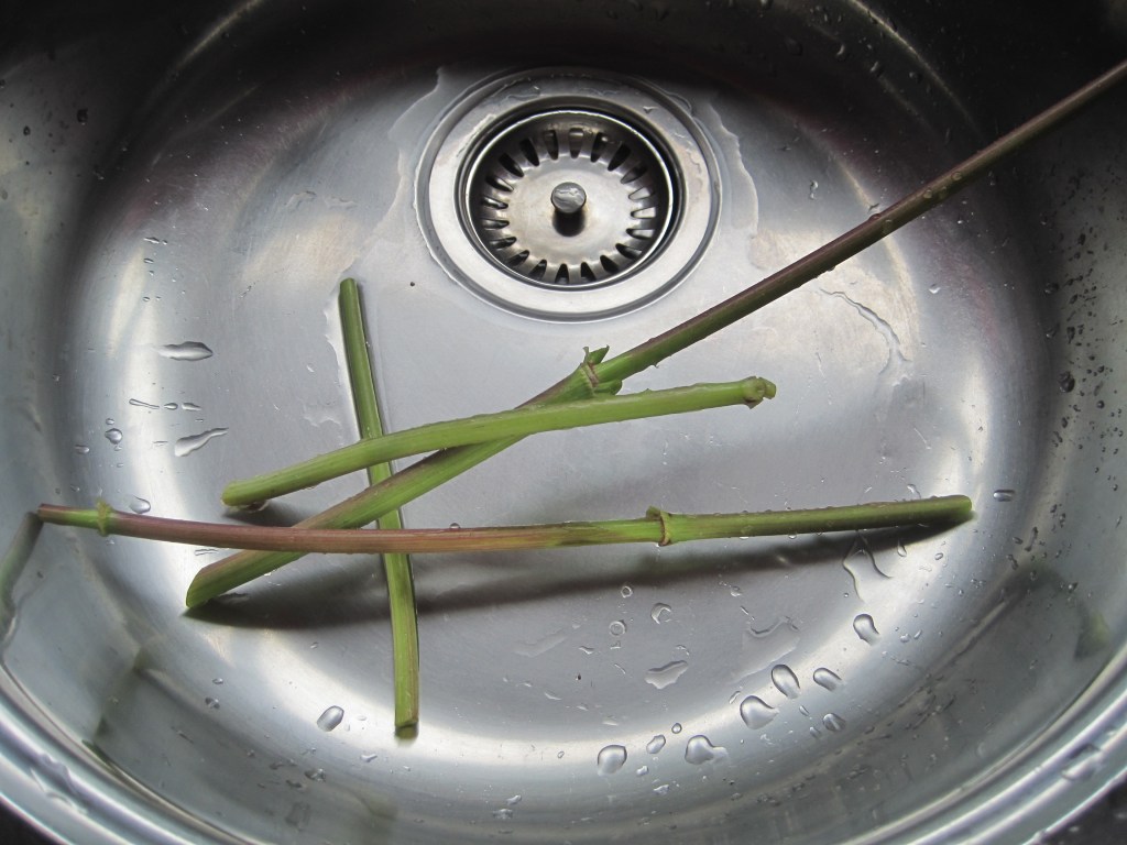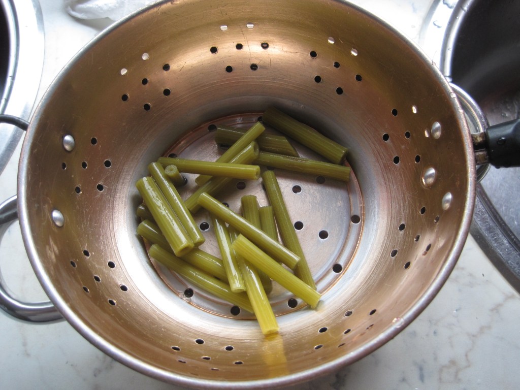 First, I cut and cooked the stems in water for about an hour to soften them. Then I made a sugar syrup from 200g sugar to 250mls of water. Stirred it well, gradually heating it before adding the drained stems.
