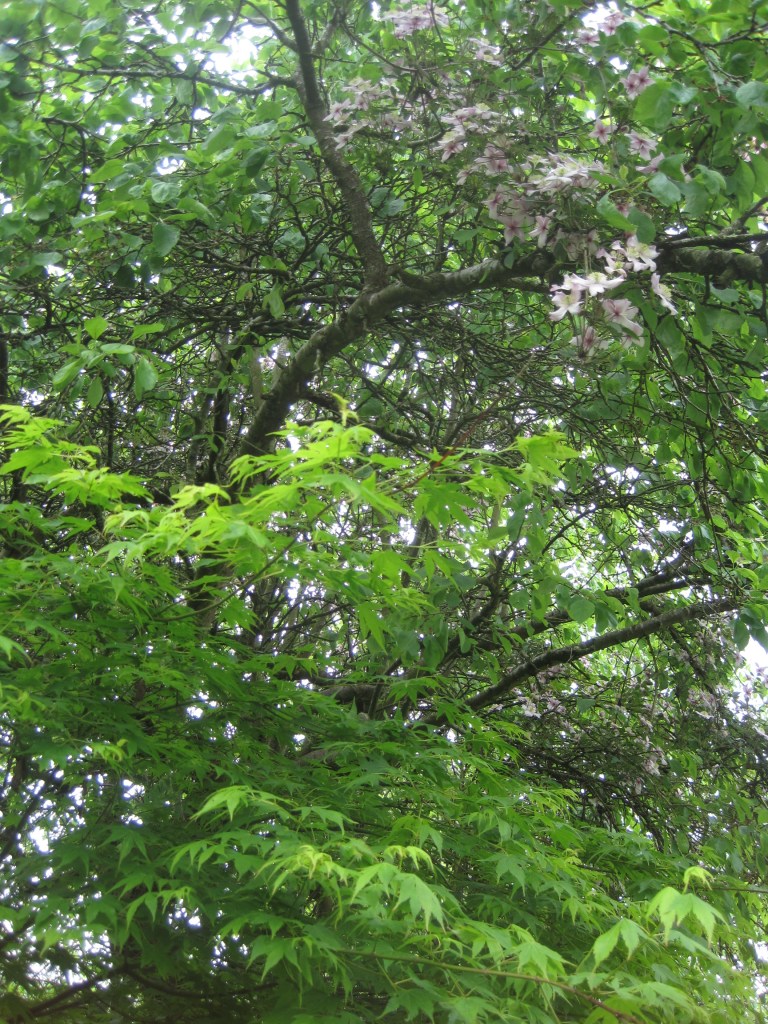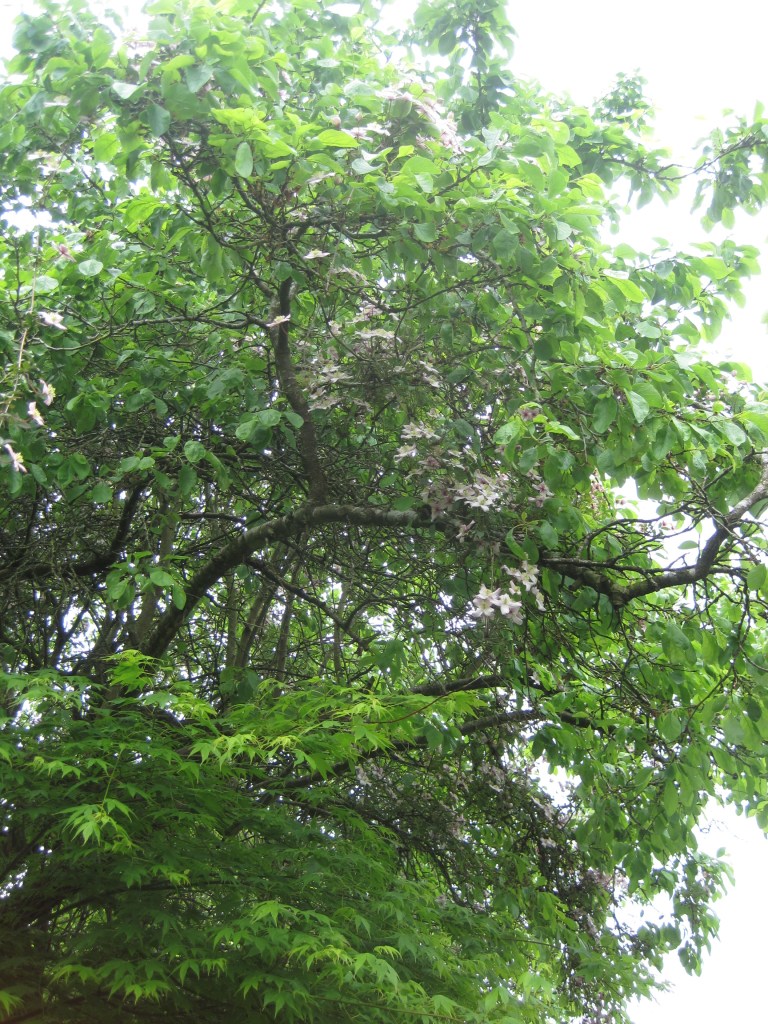 My clematis montana “Elizabeth” has grown right up into the top branches of the old plum tree. It looks lovely tumbling down among the leaves.