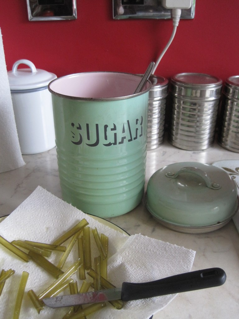 On the final day I simmered again in the syrup ( no extra sugar) for another 15 minutes. When it had cooled a little I drained it, split the stems and rolled in caster sugar. When it has dried a bit I shall store it in an airtight jar.