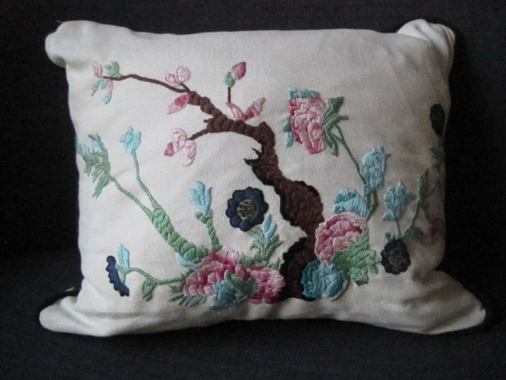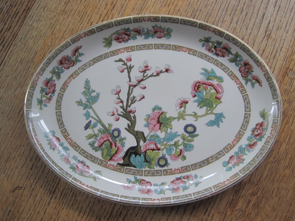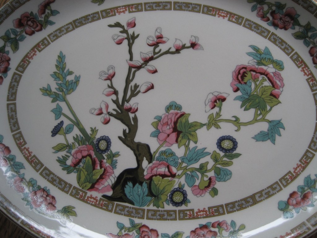I mentioned last time a cushion cover I embroidered with a pottery pattern called “Indian Tree”. Here is one of my oval plates showing the pattern. I think it has been used by many potteries but not recently. This kind of design is perhaps old-fashioned but I love it.