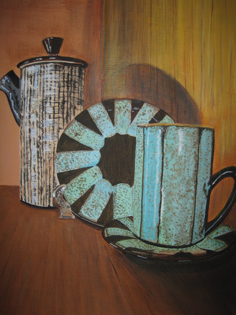 I like old pieces of pottery but I also have some contemporary studio pieces. I like them so much I even paint pictures of them. Here’s one of my small collection of Eric Leaper items.