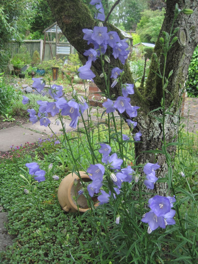 Campanula persicifolia was in the garden when we moved here and every year it pops up freely here and there. Some are blue and others are white. It’s one of my favourite flowers and I appreciate its habit of returning unbidden. There is a nice little stand of them under one of the pear trees which I think looks particularly pretty against the rough bark.