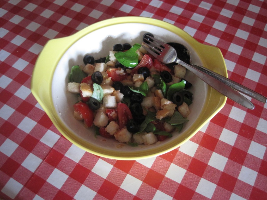 The basil in the greenhouse is lush at the moment. Fresh aromatic green leaves full of flavour. I made our favourite bread and basil salad to make the most of it. I had a few slices of dry bread to use which are ideal for this. Served with some grated cheese, it’s a nourishing meal and delicious.