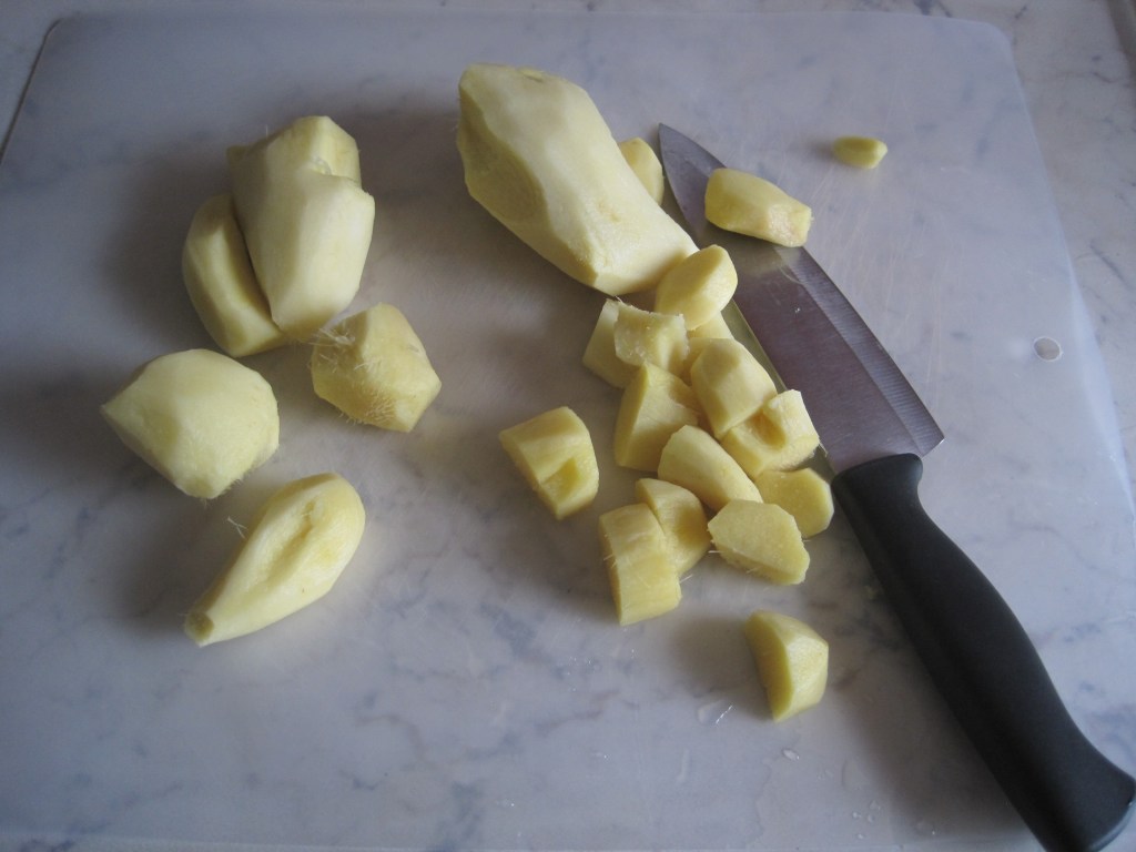 I washed and peeled the ginger root, being careful to remove all the skin then cut the ginger into small chunks. At this stage I pressure cooked the ginger in just over a litre of water at low pressure for 10 minutes. Then I turned off the heat and allowed the pan to gradually cool to release the pressure slowly.