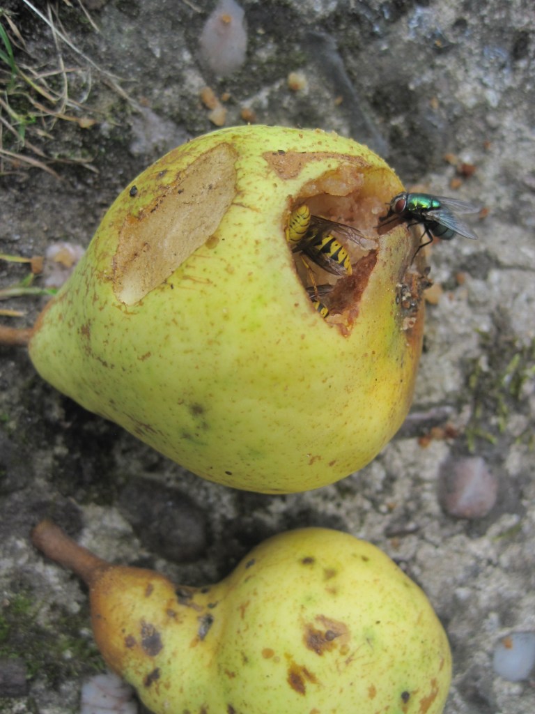 The fruit has been blowing off the trees and landing with a thud on the ground. The split and bruised pears are being feasted on by wasps and other insects. I don’t mind the wasps. They do a lot of good in the garden, taking caterpillars and other creatures that munch where I don’t want them. Everything has it’s place in an organic garden.