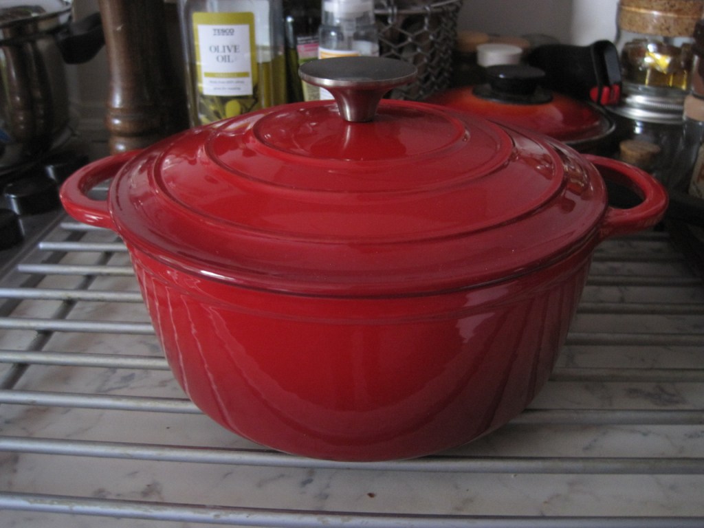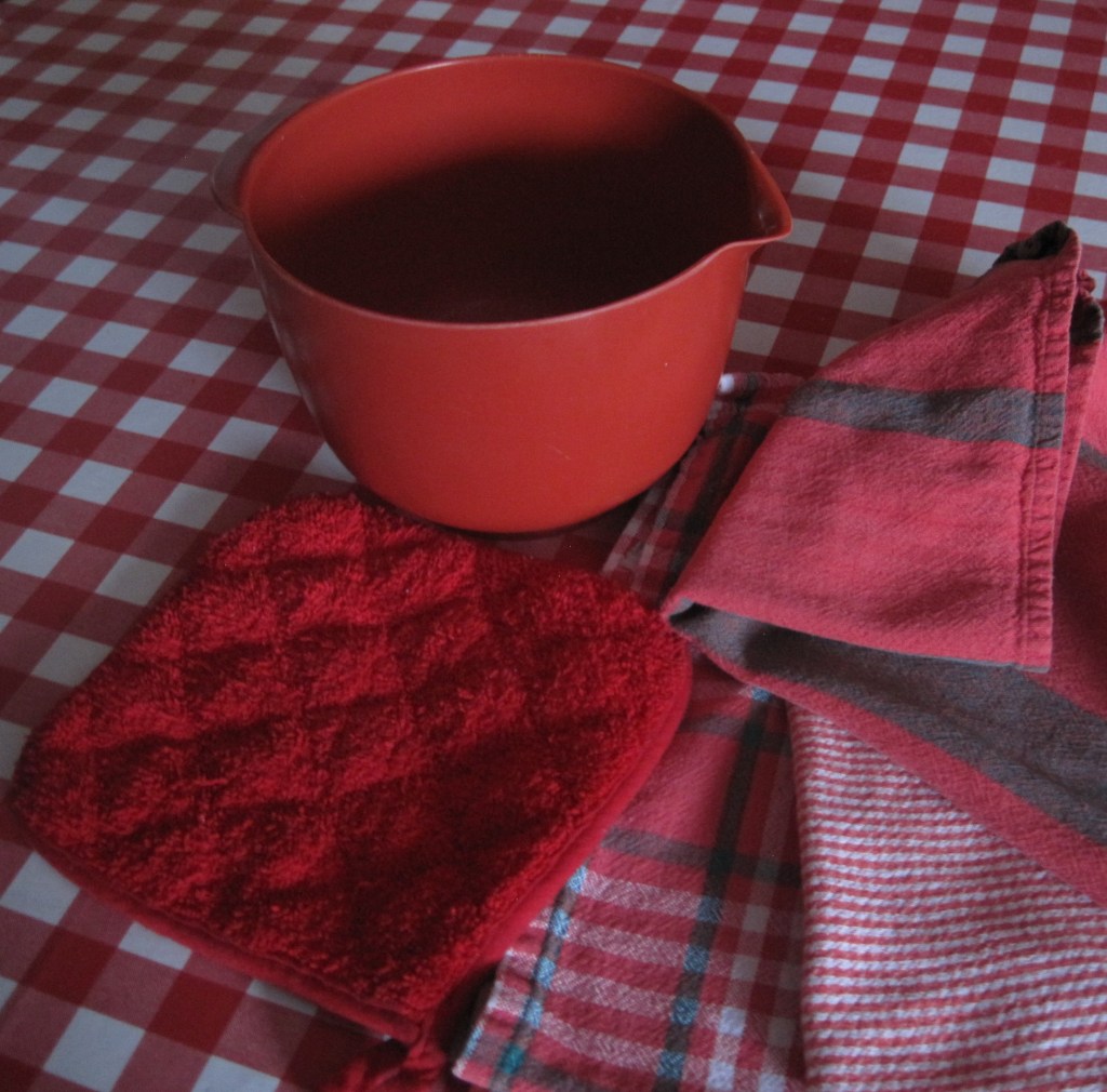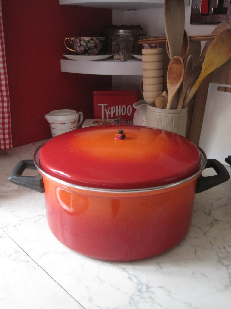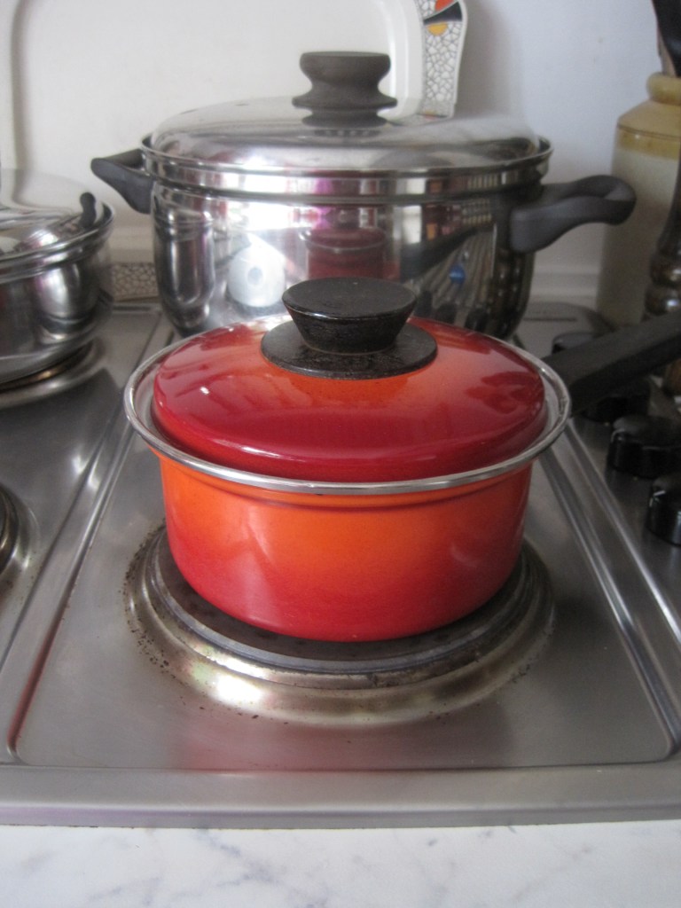 All my life I have loved the colour red. My kitchen walls are painted red. So cheerful, warm and inviting. Fifty years ago I bought a set of red pans. After all that time I only have two left but they’re often used and still appreciated. One small saucepan which I use exclusively for boiling eggs and one stock pot without a knob on its lid but still used sometimes for making jam.
