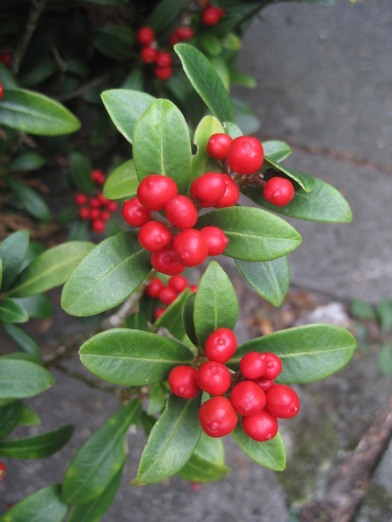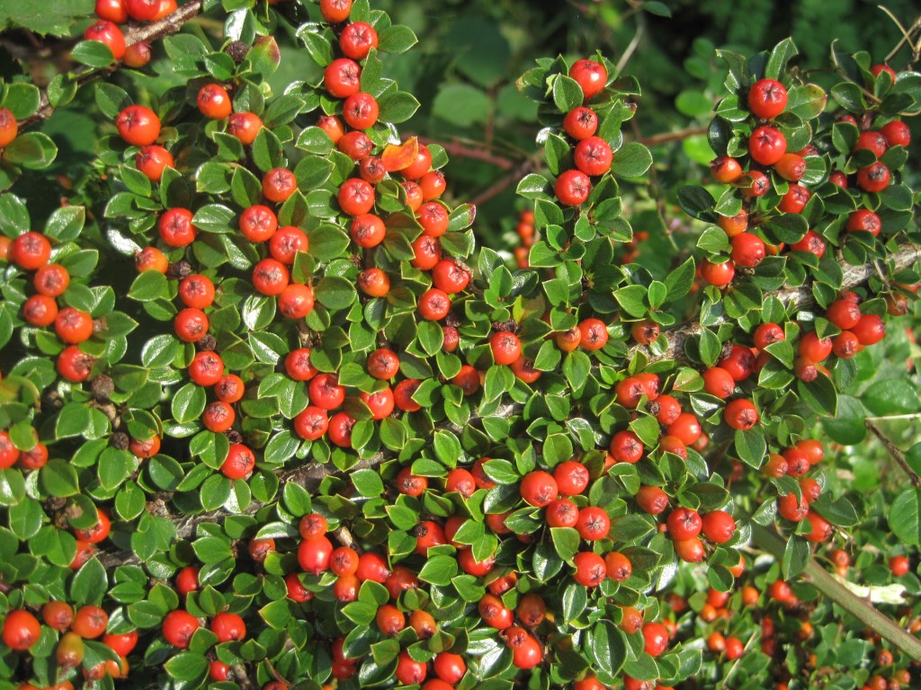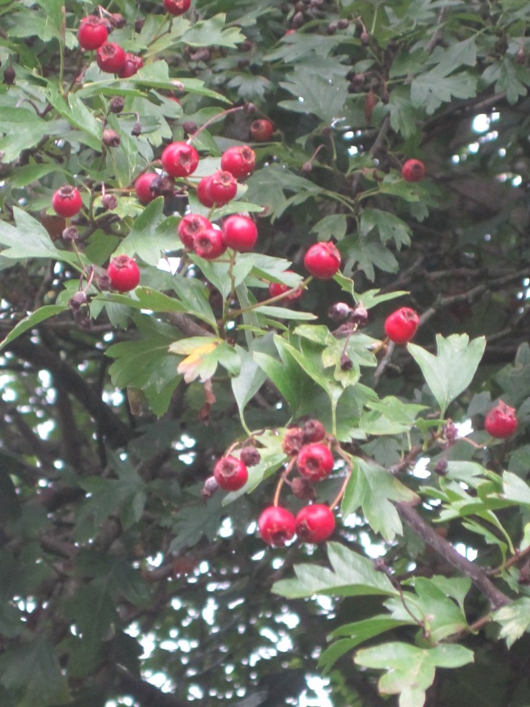 Red is so vibrant in the garden as well. The beautiful berries are glowing on the hawthorn tree, on the cotoneasters and skimmia. Reminders that summer is over but pleasing nontheless.