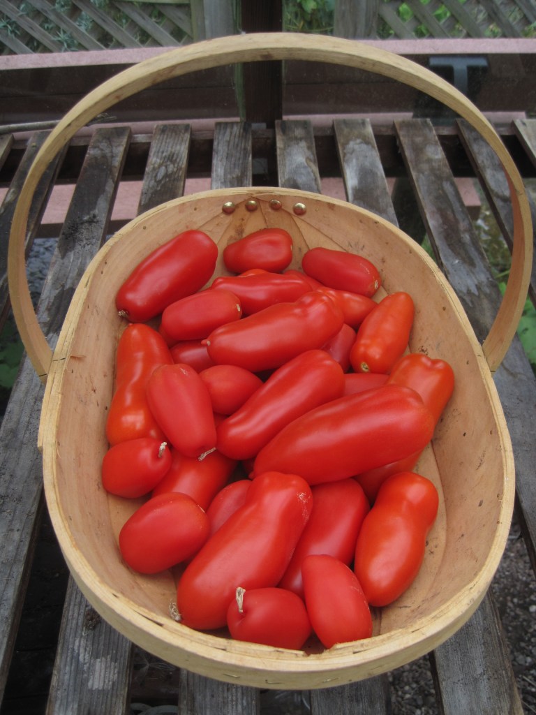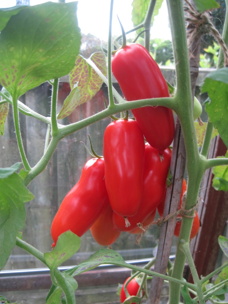 The greenhouse is ablaze with red tomatoes. I’ve grown big plum tomatoes this year. Really good to eat, not many seeds, juicy and flavoursome. I’ve had a few problems with them but they’ve still done very well. What a glorious sight!