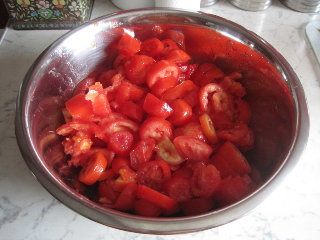 They all seemed to be ripening at once so I decided I must act quickly to preserve them. Although I’m an old hand at fruit bottling I haven’t done tomatoes before. I consulted my Soil Association preserving book for advice. I think I succeeded but only time will tell. They look fine and the jars have sealed so fingers crossed that they keep their colour and taste good when I use them. Here are a few photos of what I did.