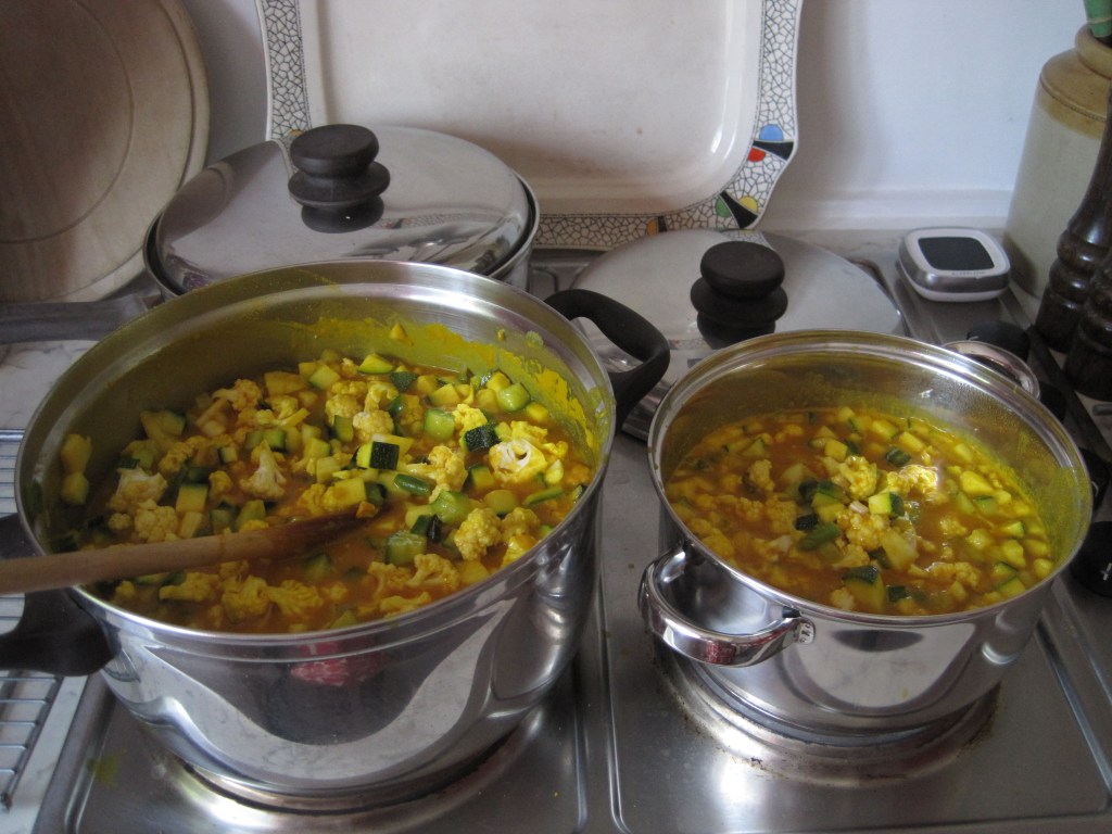 PICALILLI You need about 2kg/4lbs of the following vegetables in reasonably equal proportions. Cauliflower, Cucumber, Courgette, Onions, French or Runner Beans 2-4 Chillies, depending on how hot you want it 1 teaspoon Ground Ginger 30g/1oz Plain Flour 1 litre/2 pints Malt Vinegar 30g/1oz Turmeric 30g/1oz Mustard Powder 60g/ 2oz white Sugar Sea Salt Prepare vegs. Chop onions, break cauli into small florets and discard stalk. Cut cucumbers and courgettes into small cubes. A mixture of French and Runner Beans can be used. Thawed frozen beans can be used if fresh are not available. Cut into small pieces. Place the prepared vegs into a large ceramic or stainless steel bowl and sprinkle well with sea salt. Cover and leave in a cool place for 24 hours. Next day, drain well. Sterilise jars by washing and rinsing thoroughly before placing in a cool oven to heat and dry. Wipe washed lids with kitchen paper, ensuring all are sound and vinegar resistant. Put them somewhere clean and warm to dry. Chop chillies finely. Wash hands immediately to prevent irritation to eyes. Mix mustard and flour to a runny paste with a little of the vinegar. Put vinegar to boil with turmeric, chillies, sugar and ginger.When boiling, pour in the mustard paste, stirring well, to thicken. Add all the vegs and cook for 5-15 minutes, depending on how crunchy or soft you like it. Meanwhile prepare a surface to hold the hot jars. Have a wooden board, if available, covered with a layer of newspaper and kitchen paper or folded teatowel(remember though that turmeric stains). This will prevent the jars from touching a cold surface which could crack them. Remove and fill the jars one at at a time. While still hot fill the heated jars, using a ladle and a funnel to keep the rims clean. Screw the lids on firmly while still hot using a cloth or oven gloves. Lids will make a popping sound as the vacuum formed inside sucks the lids on. This indicates they are sealed. Sealed jars will keep for a year or more but if they haven't sealed the picalilli will still keep well for some time. Store in a cool, dry and dark place.