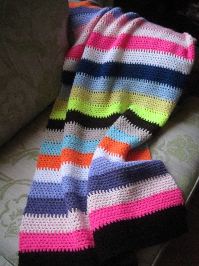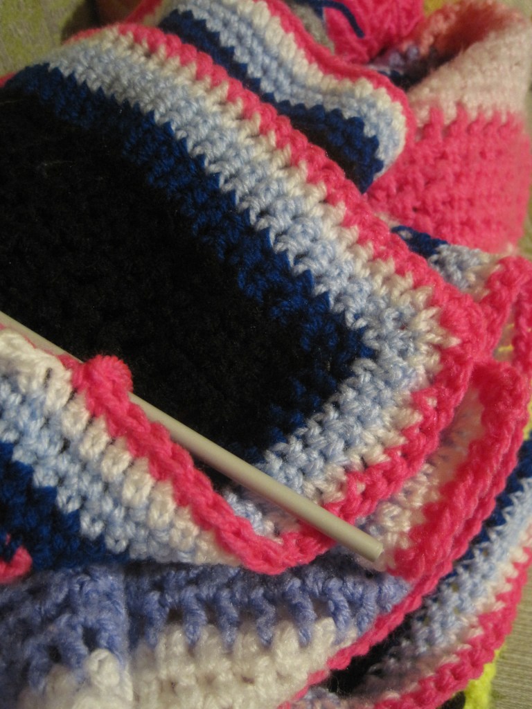 I made two colourful blankets last year from a large bag of yarn in mixed colours. I made the second one a bit small because I thought I might run out of yarn. But in the end I did have some half balls left and it has bothered me that the second blanket is on the small side. So I got out my hook and I’m adding a striped border to expand it.