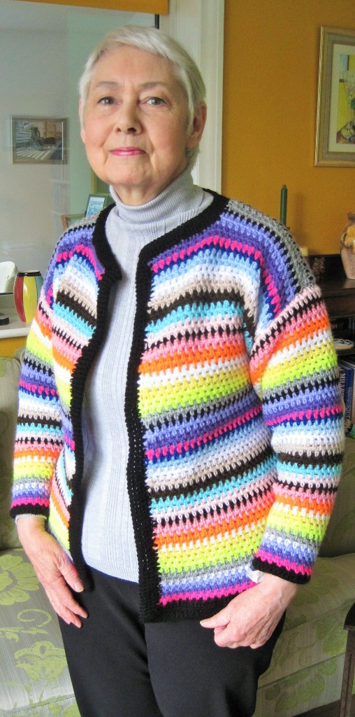 I find it very difficult to follow a complicated pattern so I often make up my own. Mostly works for me. Making it up as I work I can crochet or knit a simple style of jacket with dropped sleeves because the shaping is much easier to do. This one I crocheted from the same bag of yarn. I certainly had my money’s worth when I bought that bag.