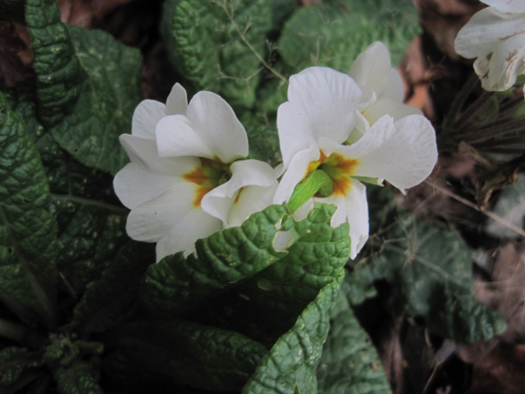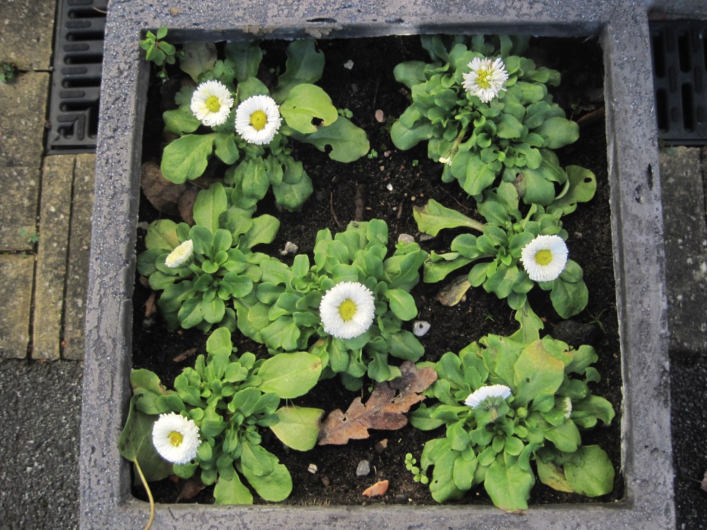 In two pots by the garage door there are some lovely little white Bellis daisies. These have grown from seed dropped by last year’s flowers. There was just enough of them to divide between the two pots and now they’re flowering. Although they look dainty and fresh they’re as tough as old boots and will take frost in their stride.