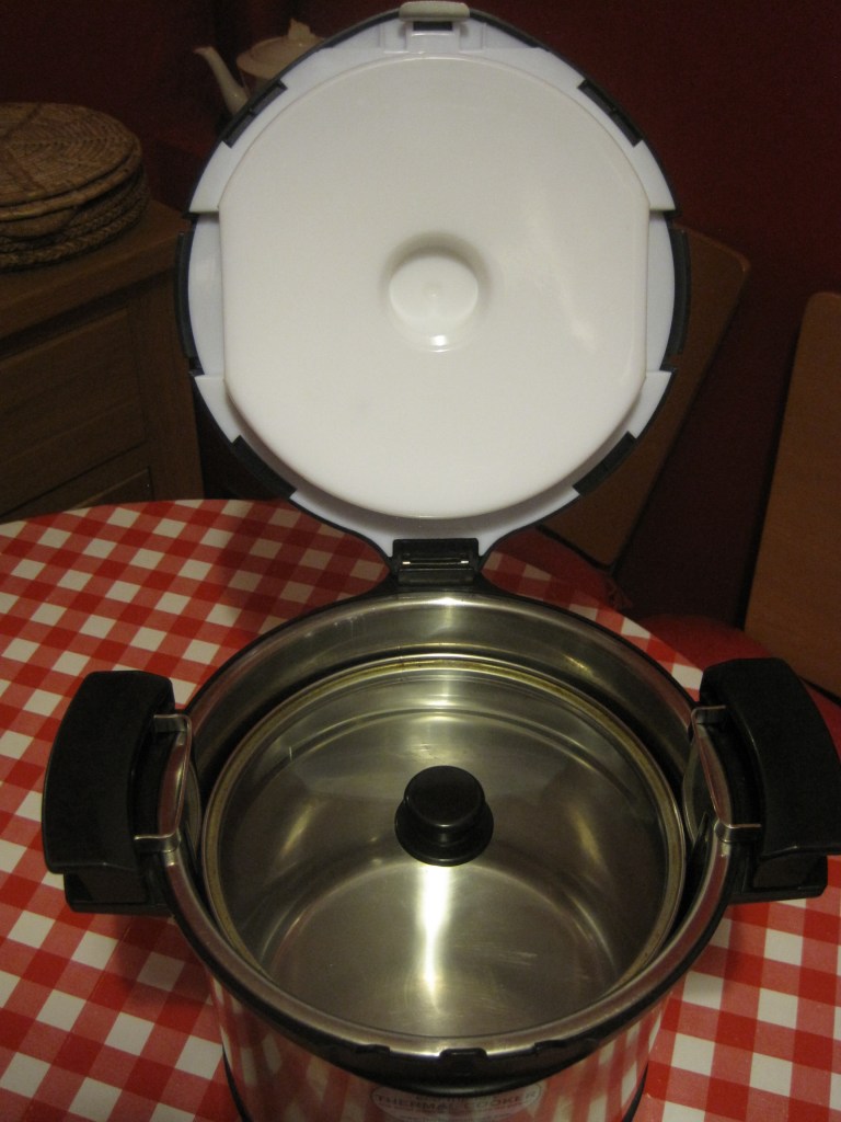 It will take a small, whole chicken, a meat joint or a ham. A few minutes of simmering on the hob then the pan is placed inside the thermal shell and left to continue cooking for a few hours without power. I was sceptical before I tried it that meat cooked in this way would taste as good but I needn’t have worried. The meat is tender and delicious. I add a couple of stock cubes to the water and it works well. Vegetables can be added too. It’s also good for rice pudding and if you don’t like the skin that forms in the oven, this is ideal.