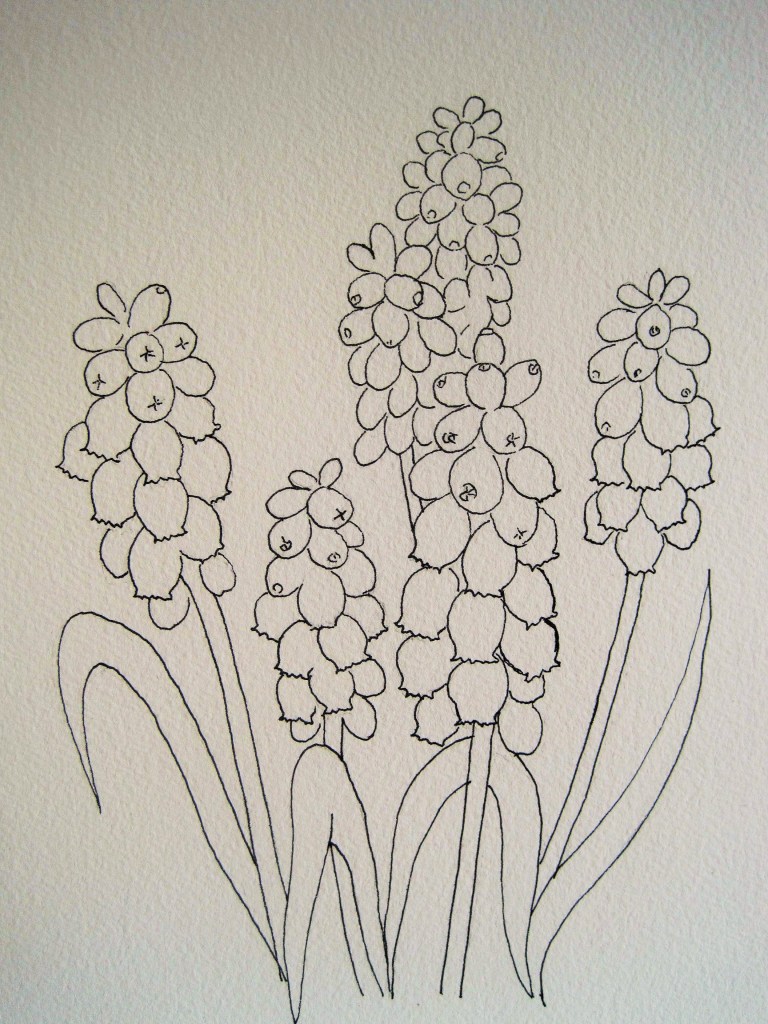 The garden flowers have inspired me to start a tiny painting of some Muscari, often known as Grape Hyacinths. I have only drawn it so far and outlined it with pen. I shall paint it with gouache in beautiful bright blues and greens.