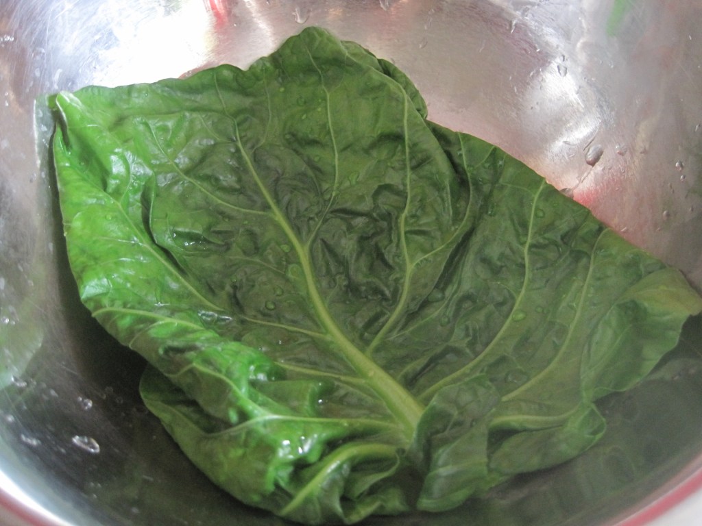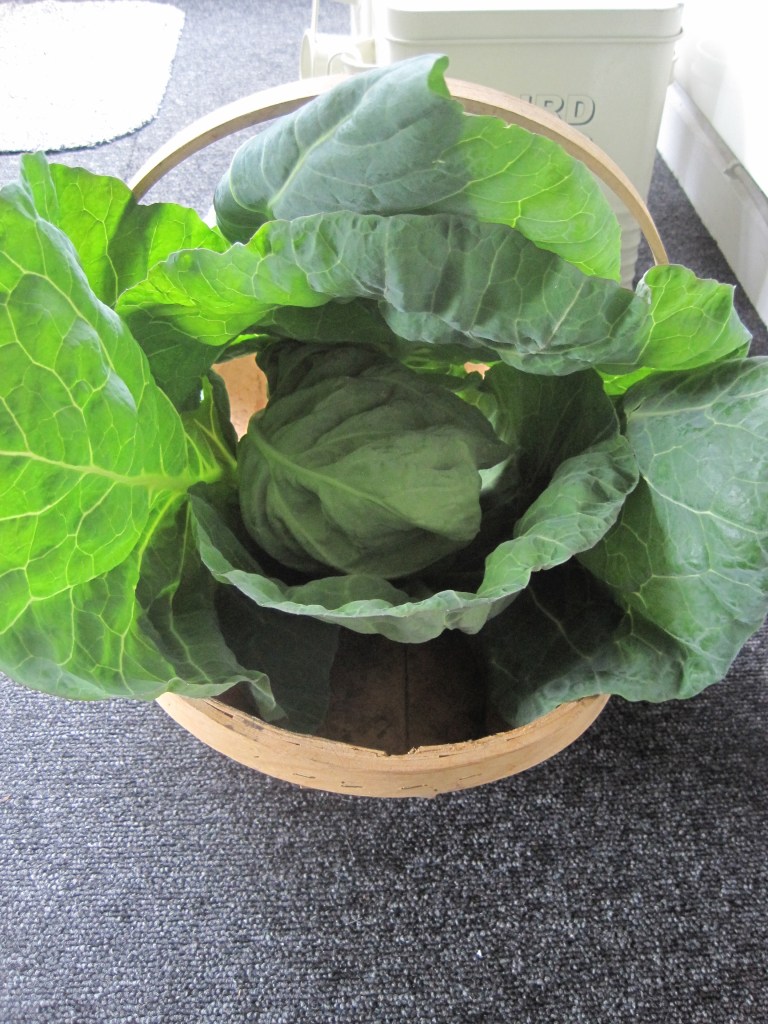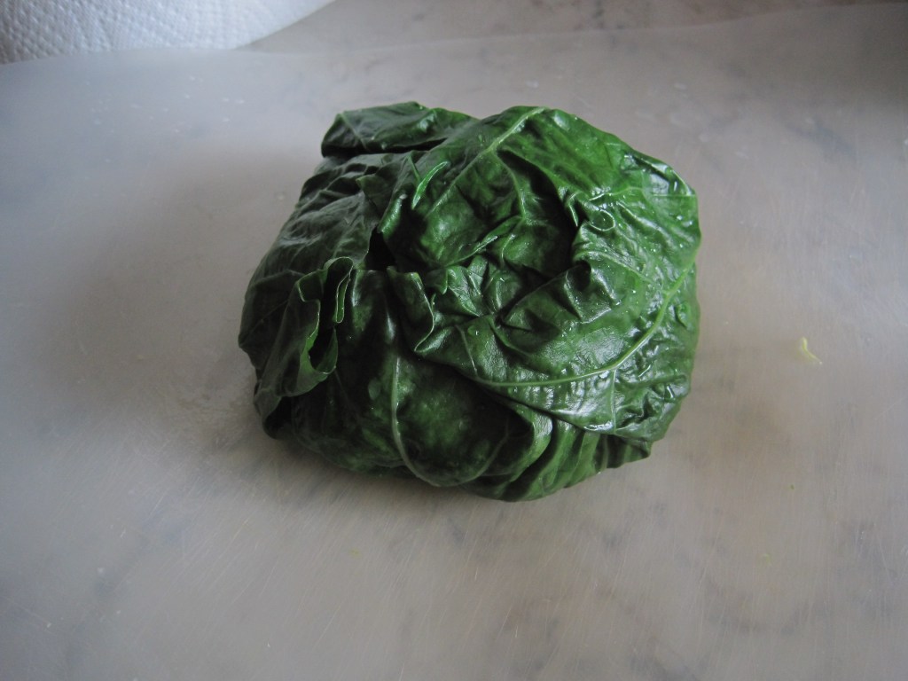 So I harvested a lovely cabbage for an experiment. I made cabbage parcels. These are cabbage leaves wrapped around a filling. I popped them inside the cake tin, which stands in boiling water in the pan, simmered the water for ten minutes, then transferred the pan to the thermal container and left it for three hours. No electricity required at this stage. It would have taken at least forty-five minutes in the oven with a surrounding sauce or stock or much longer by steaming on the hob.