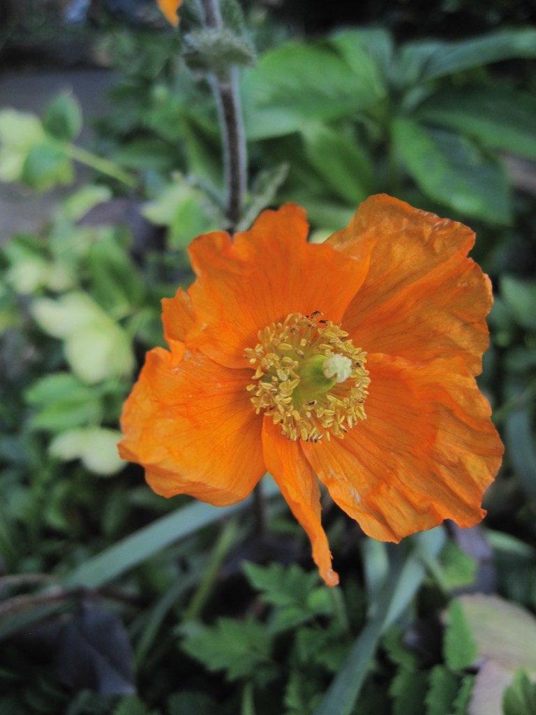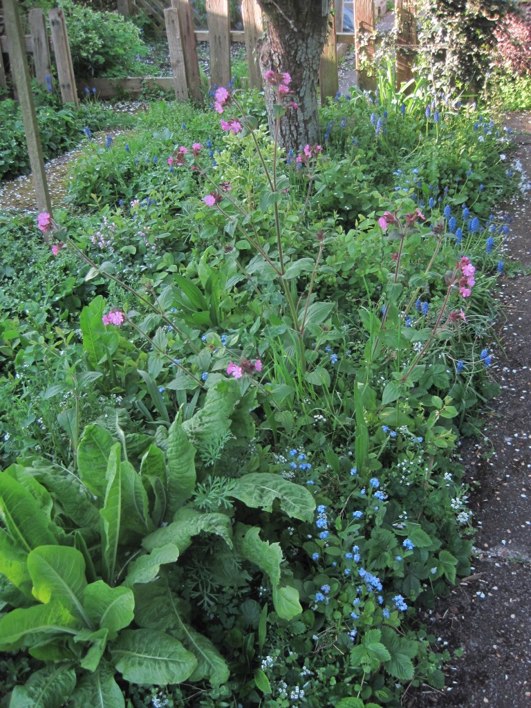 Forget-me-nots with their dainty blue flowers and citrus yellow, or orange, Welsh poppies are springing up here and there. The poppy petals are like crumpled silk. So lovely. The seeds blow around in the Summer and I let them flower where they choose. Nature has a big part to play in this garden.