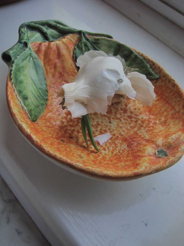 My stored garlic from last year’s crop is on its last legs. I just have two bulbs left and they’re sprouting and losing their juicyness. This year’s look promising but won’t be ready for a few more weeks. I might have to dig one up before harvest time.