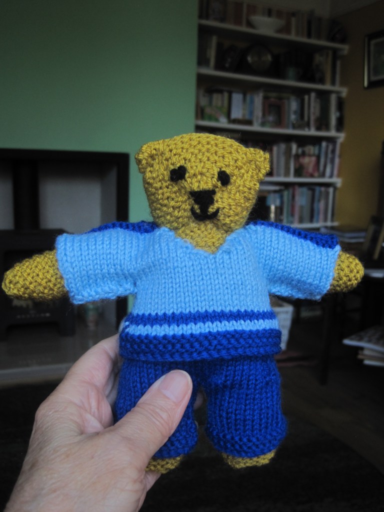 My knitting needles have been clicking again. I’m making small teddies. One is finished and he’s now smartly dressed in trousers and jumper. Another is on the way and will probably have a dress. A pleasant way to spend a little time and fun to see the end result.