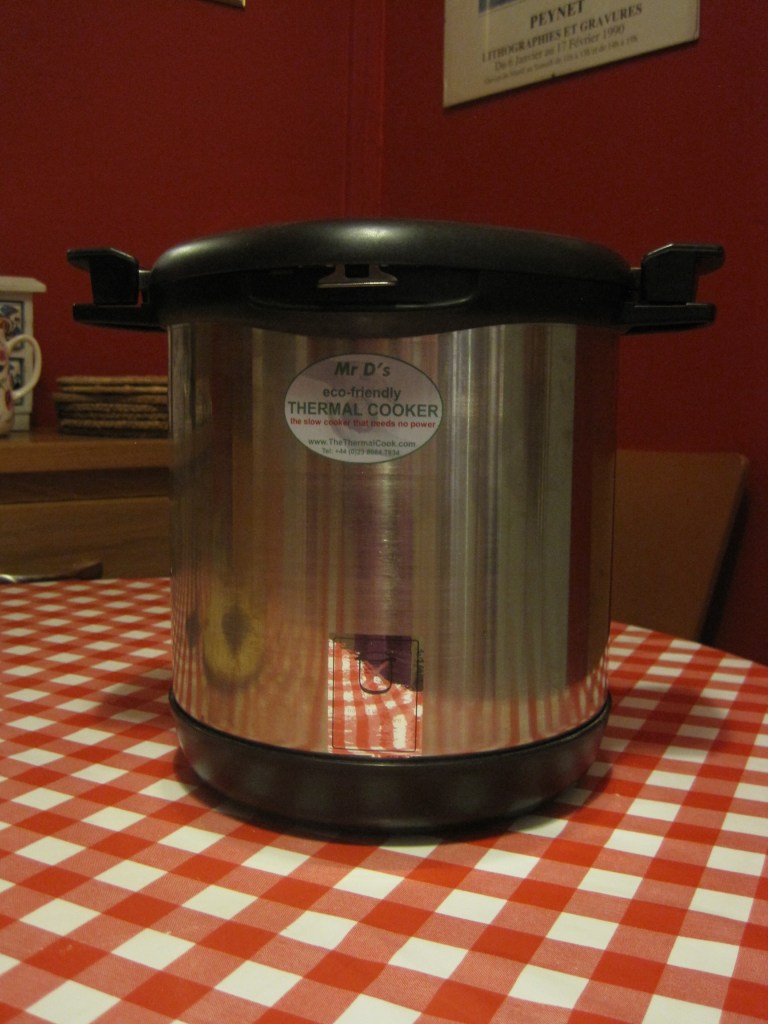 Some of my readers might remember I have a thermal cooker. It’s basically a large thermal flask with an inner pan which enables me to cook with a minimum of power. I use it to cook meat and soups mainly but I remembered I had a cake tin which sits on a trivet inside. I only made one cake and didn’t like it. It was soggy and solid. But, I began thinking that with the ridiculous cost of electricity perhaps I could use it to cook other things.