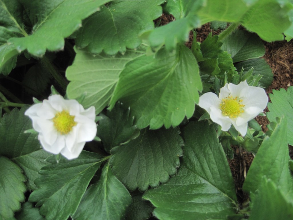 The strawberries are flowering so there will be delicious treats in a few weeks. Meanwhile the blossom is very beautiful and so are the leaves. It will be important to keep them watered now especially with so many dry days.