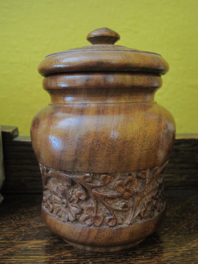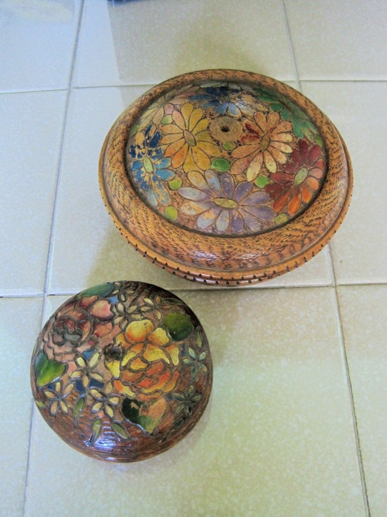 These two bowls were made with Edwardian pokerwork. The design was burnt into the wood and painted. The bigger one belonged to a much-loved aunt and the little one was found in a flea market. Both have lost the knob from the lid and the paint is very worn but I love them.