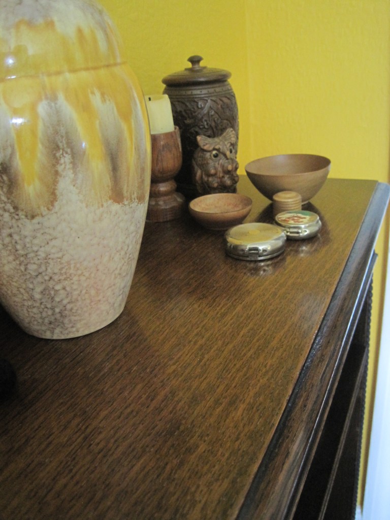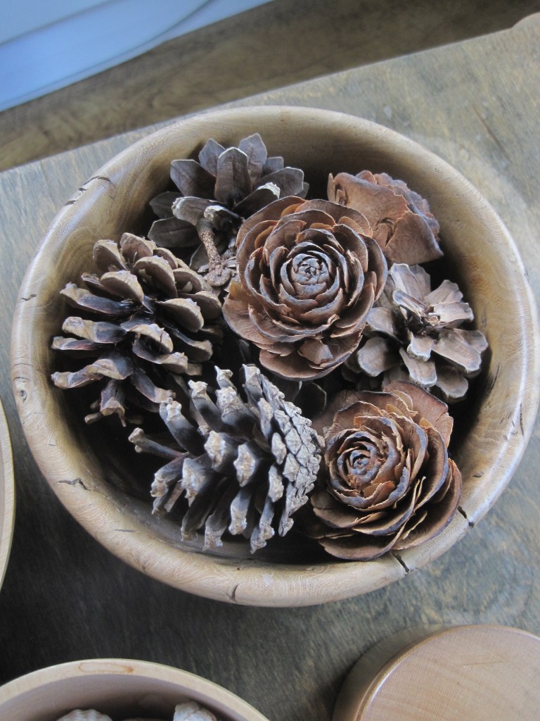 This little collection has special memories for me. My husband made the candlestick from a piece of oak he found in a previous home, he made the wooden bowls and tiny lidded box while he was teaching students how to turn wood. The tobacco jar was a find at an antique fair and still has a tobacco fragrance when the lid’s removed. The little owl was found in a Canadian junk shop.