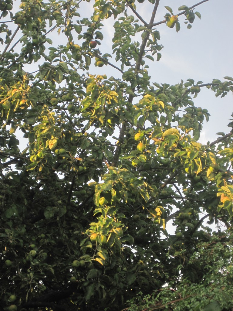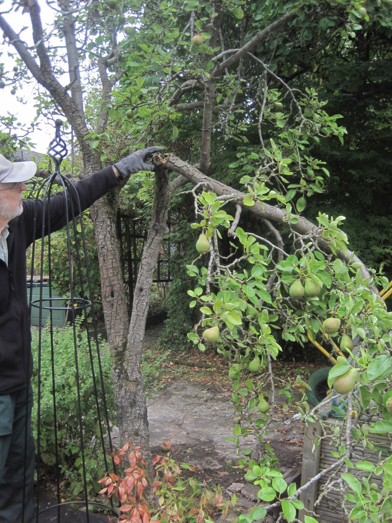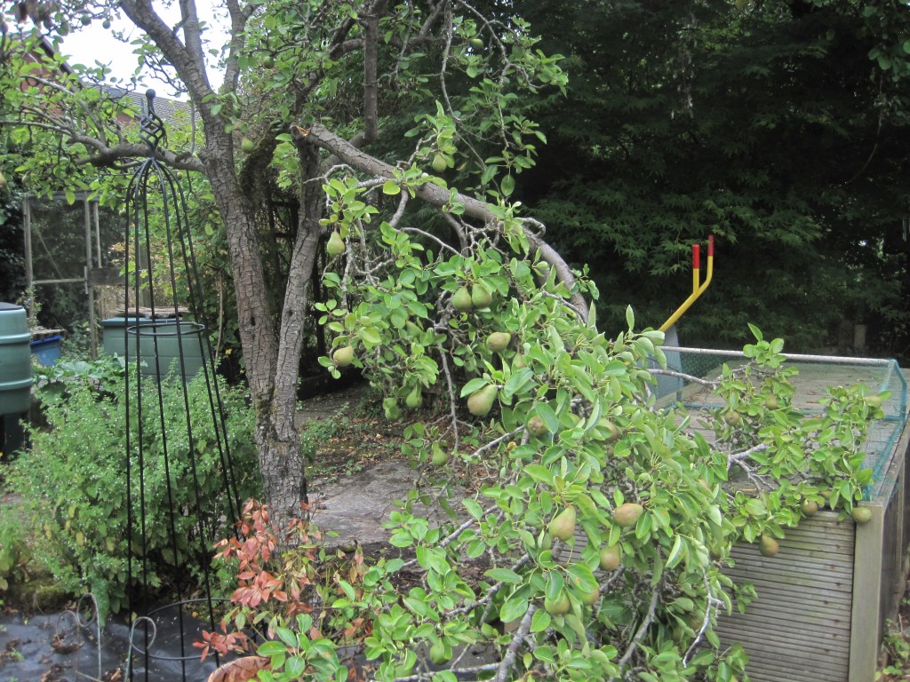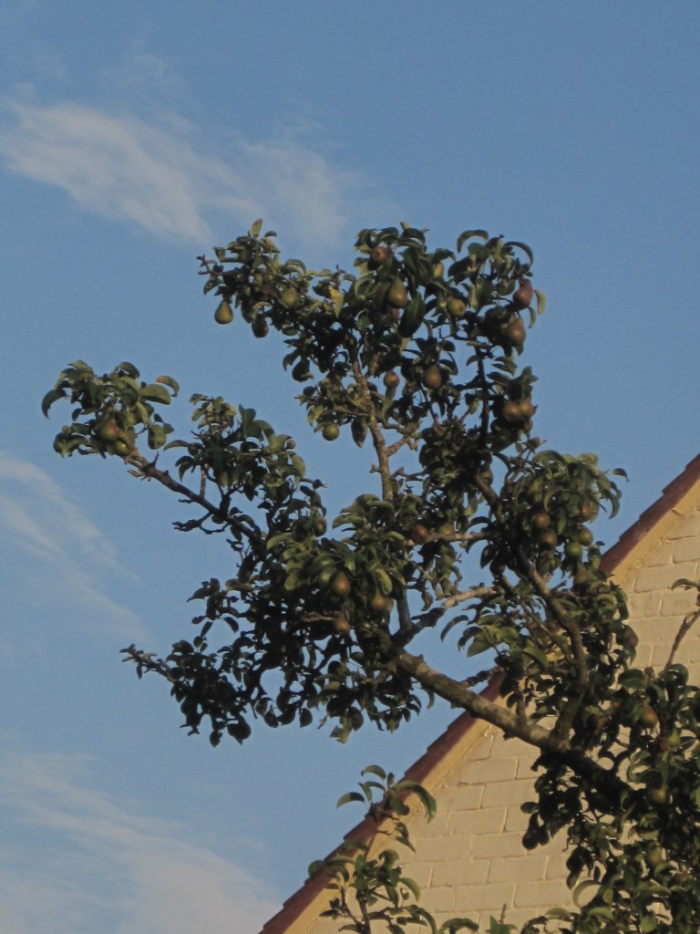 This weekend we discovered that a branch of one of the pear trees had broken with the weight of the fruit. The tree was top-heavy with branches that splay and laden with swelling pears. The burden was just too much and the branch had almost snapped off. Allan sawed it off and put the pears in a bucket. They’re not fully grown but I’m hoping they just might ripen and be useable.