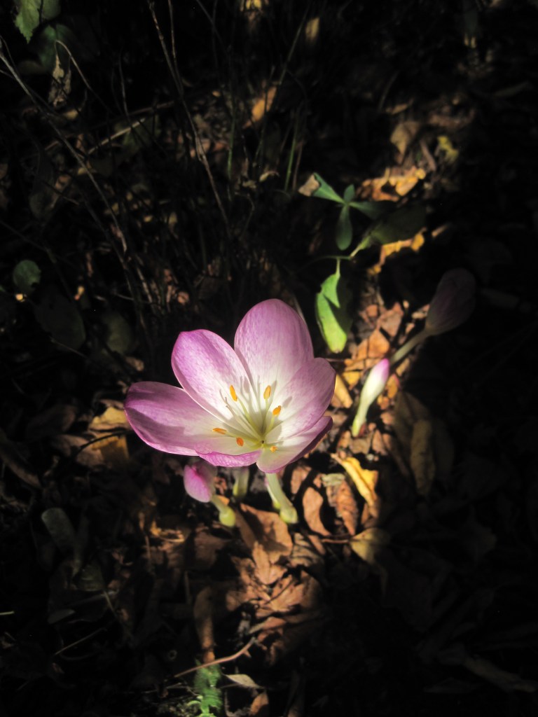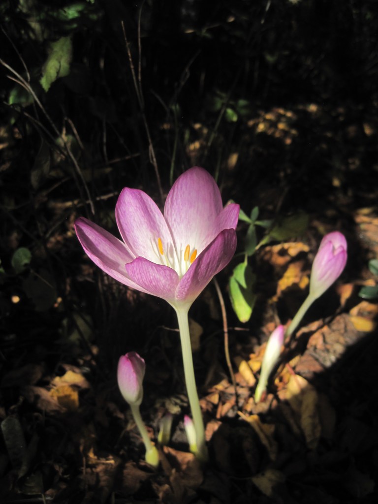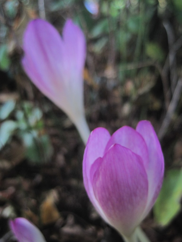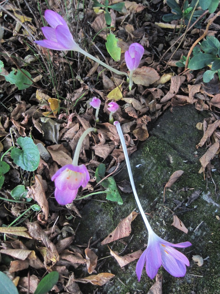 The beautiful and delicate colchicums, known as “Autumn Crocus” are appearing beneath the trees and opposite the kitchen window. I love their fragility, but unfortunately, their slender stems do flop. I need to grow something for them to stand among so the stems are supported. Wonderful though.
