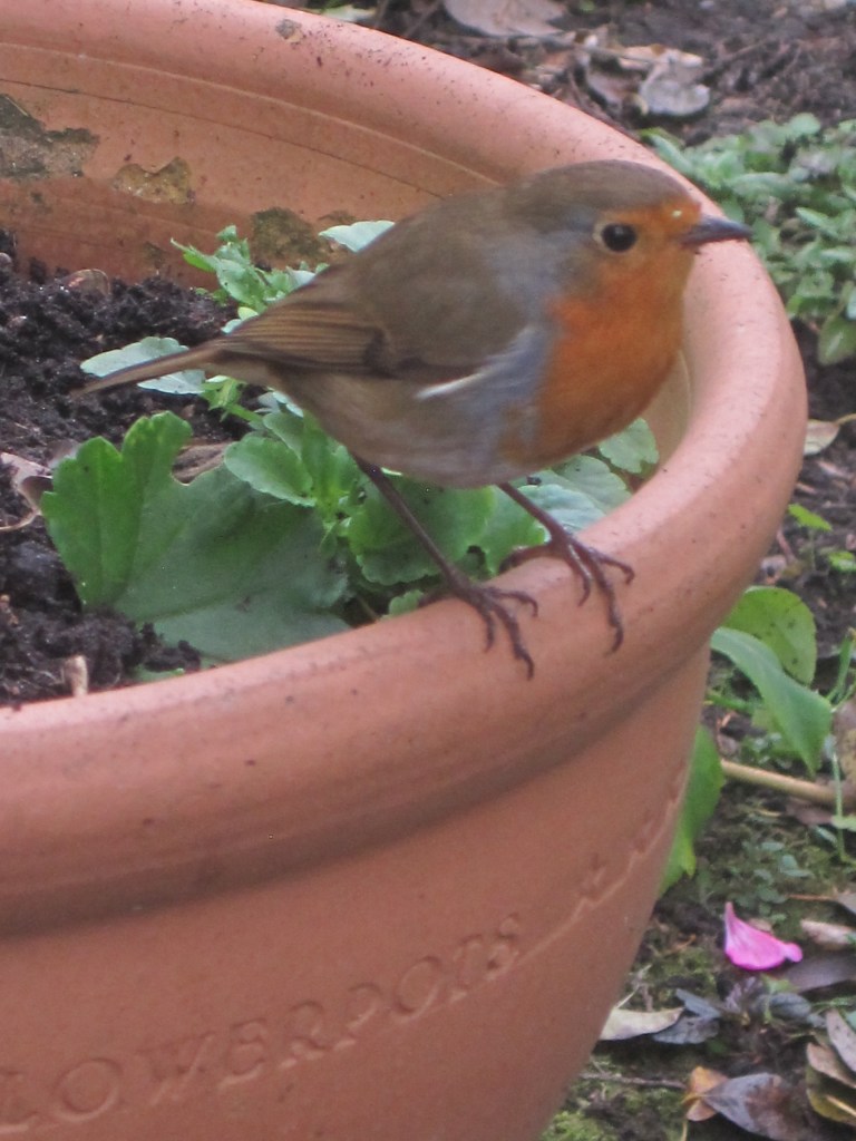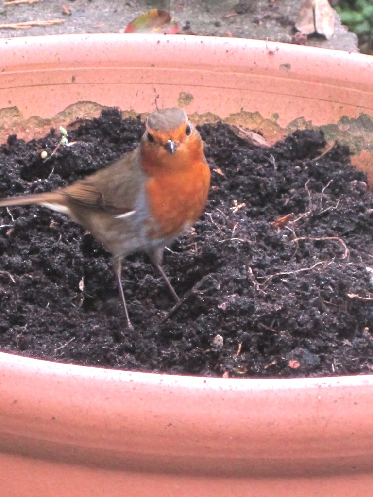 The robin joined me while I was planting some in pots. Hopping from pot to pot, he investigated thoroughly.