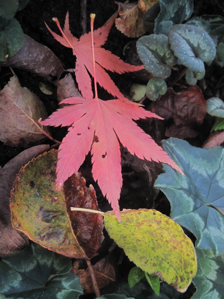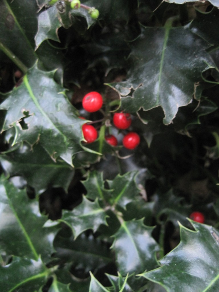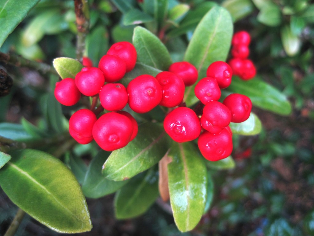 There are lovely leaves and berries around the garden. The holly hedge has some scarlet gems and the skimmia is always a show. The leaf bin is pleasingly full and will make leaf mould for next year and the following year.
