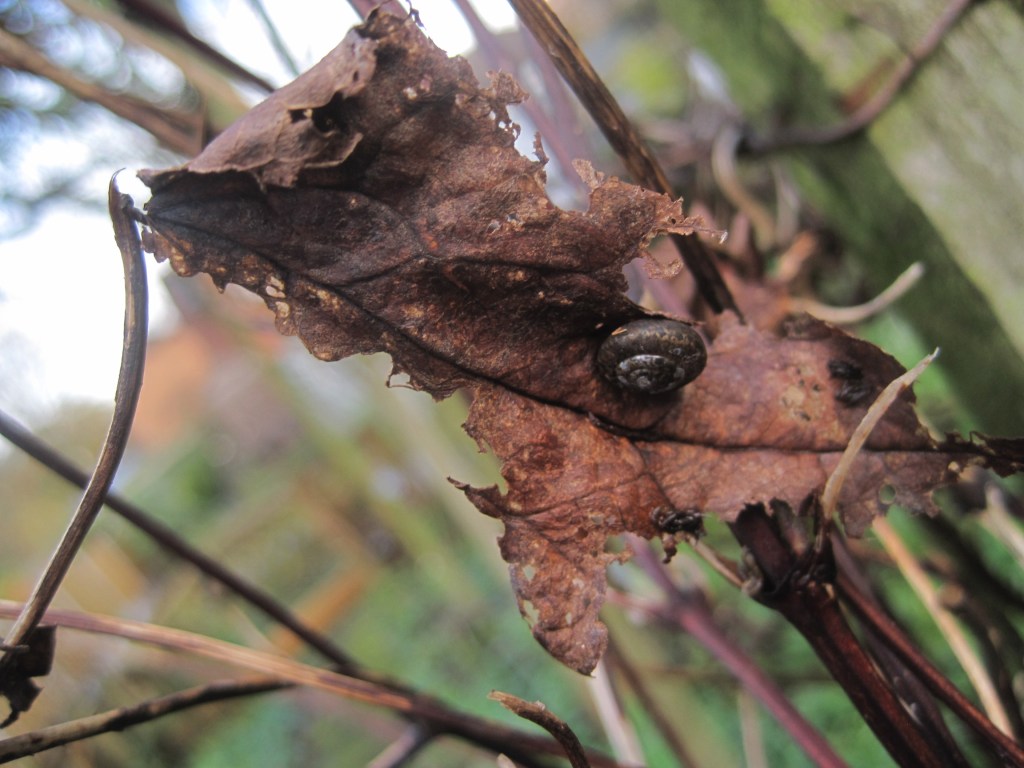 I spotted a tiny snail clinging on to a brown and shrivelled leaf.