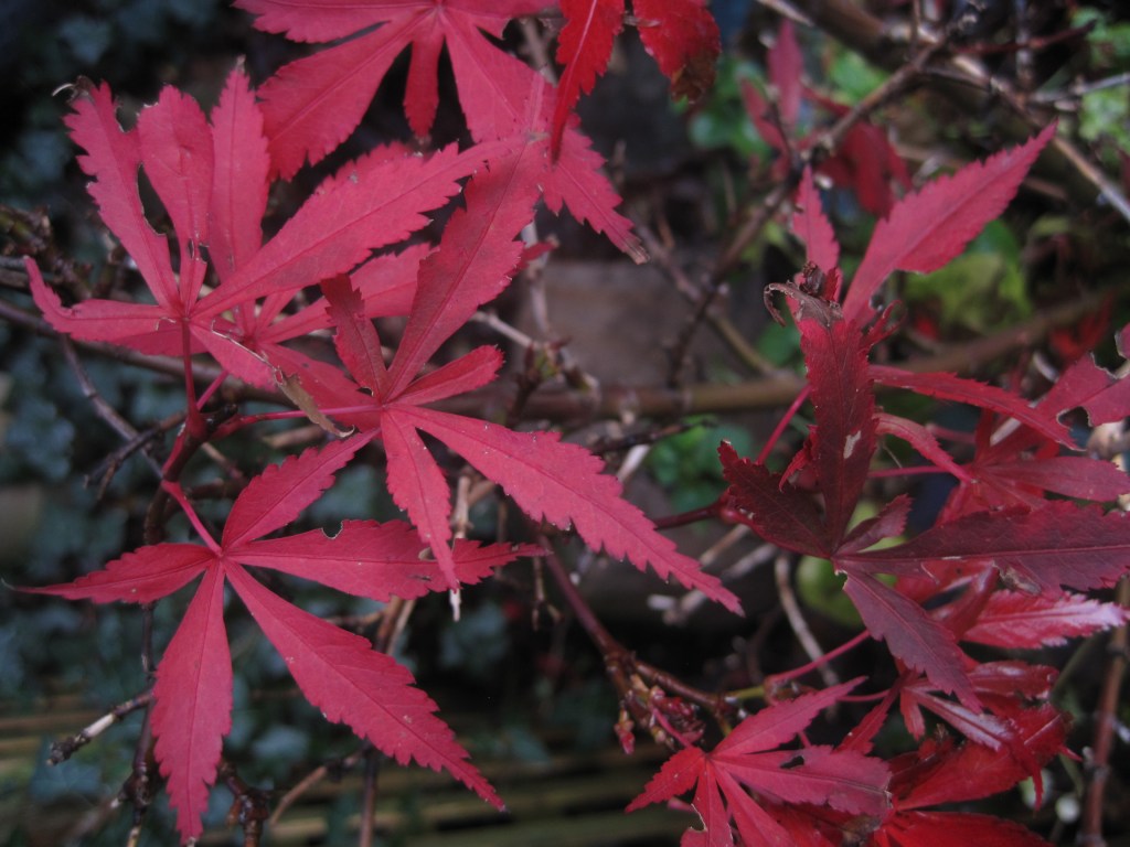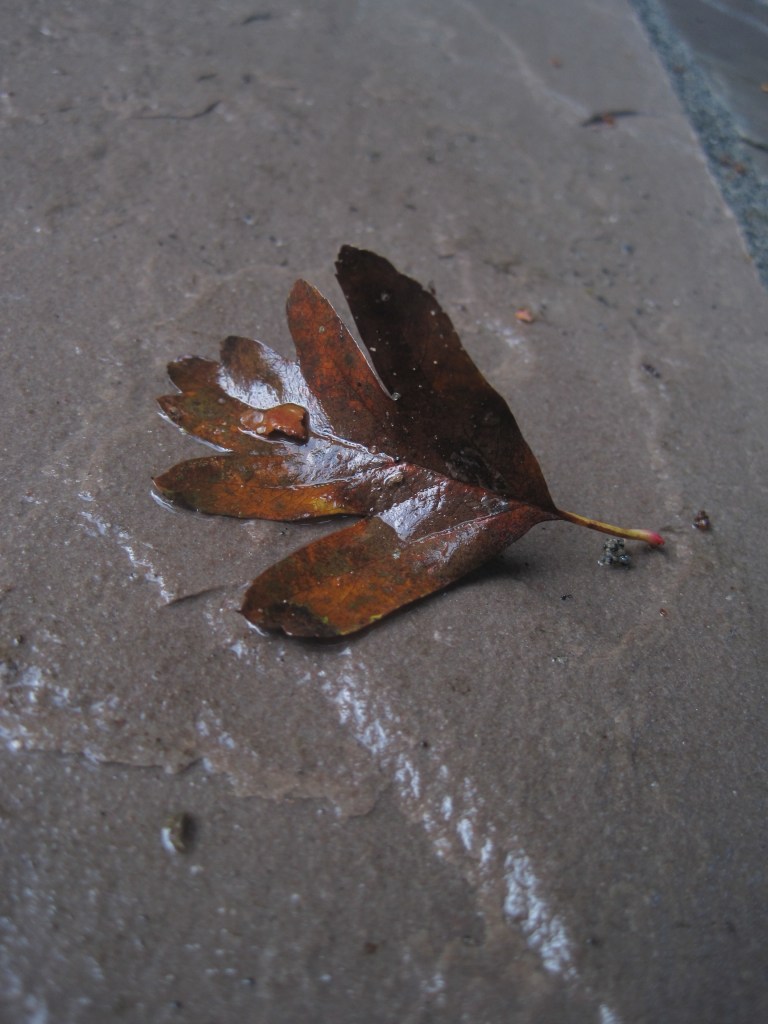 One birthday treat was a visit to our favourite local nursery to buy plants. Always a pleasure for me. I have popped the plants into a bed which was created when we had the landscaping done. Meanwhile, I look around the garden and find pleasure in the leaves. Some still clinging on and others glistening wet on the paths.