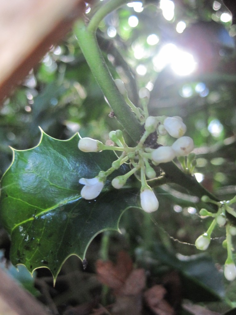 You don’t often see the white flowers on holly but there is a little cluster of buds just behind a trellis fence which I managed to catch with my camera.