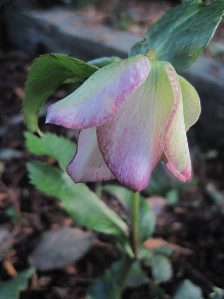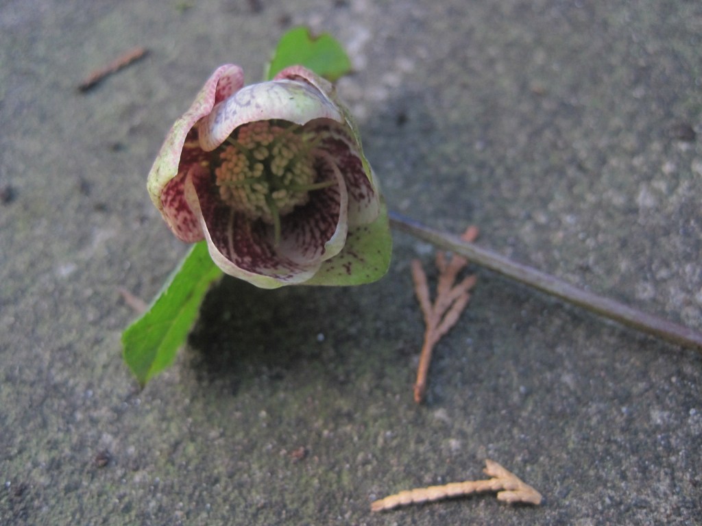 I did a bit of tidying around my hellebore border, removing damaged leaves and debris which had blown over emerging shoots. I was annoyed with myself when I found I had snipped off a little flower. I brought it in with some snowdrops to make a tiny arrangement in a small wine glass, so all was not lost after all.