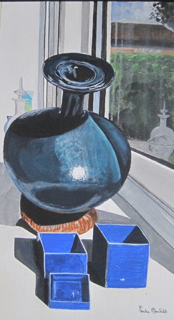 I hope you enjoyed seeing these examples. Finally, here is a painting I did of a favourite pot made by a friend and some little boxes made by my husband. I painted these with acrylics on a canvas board.